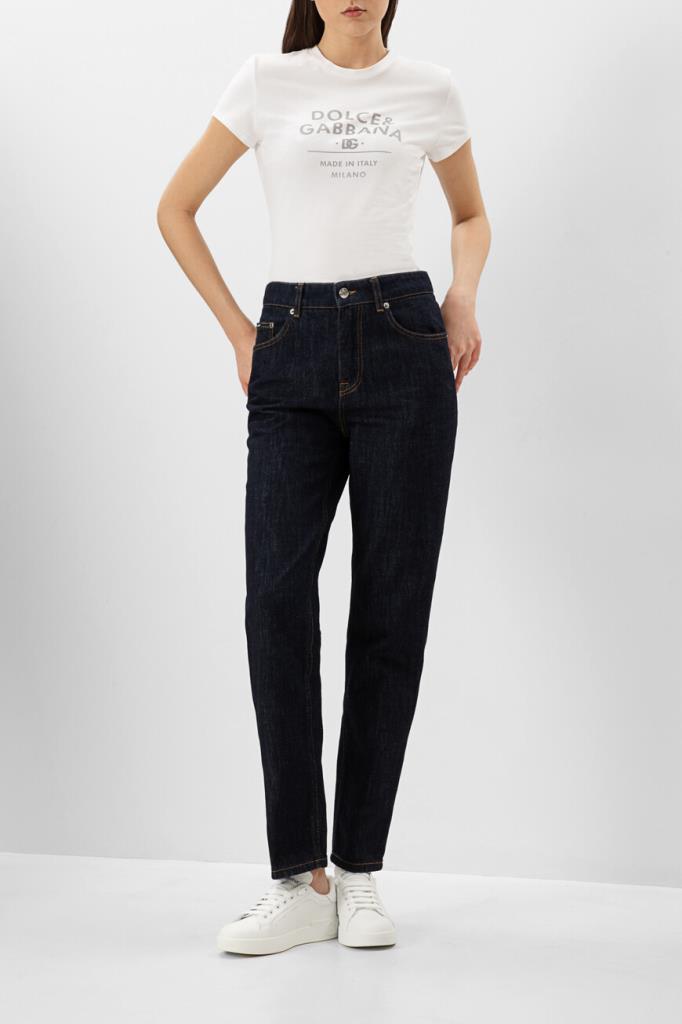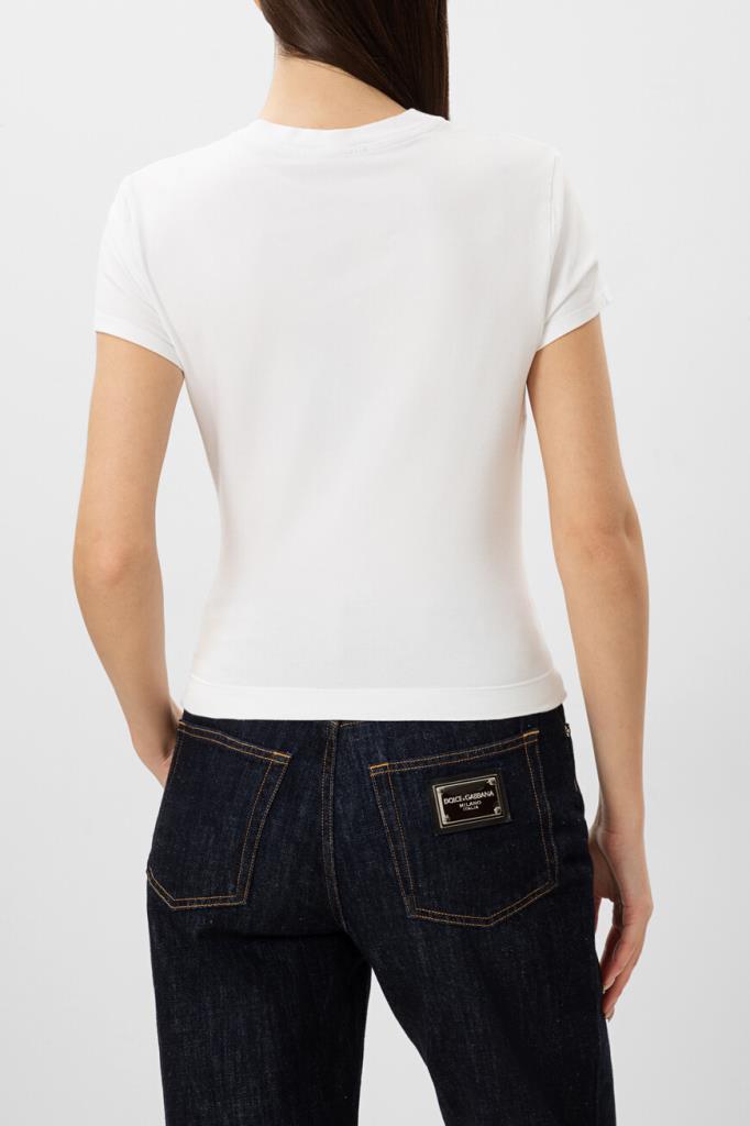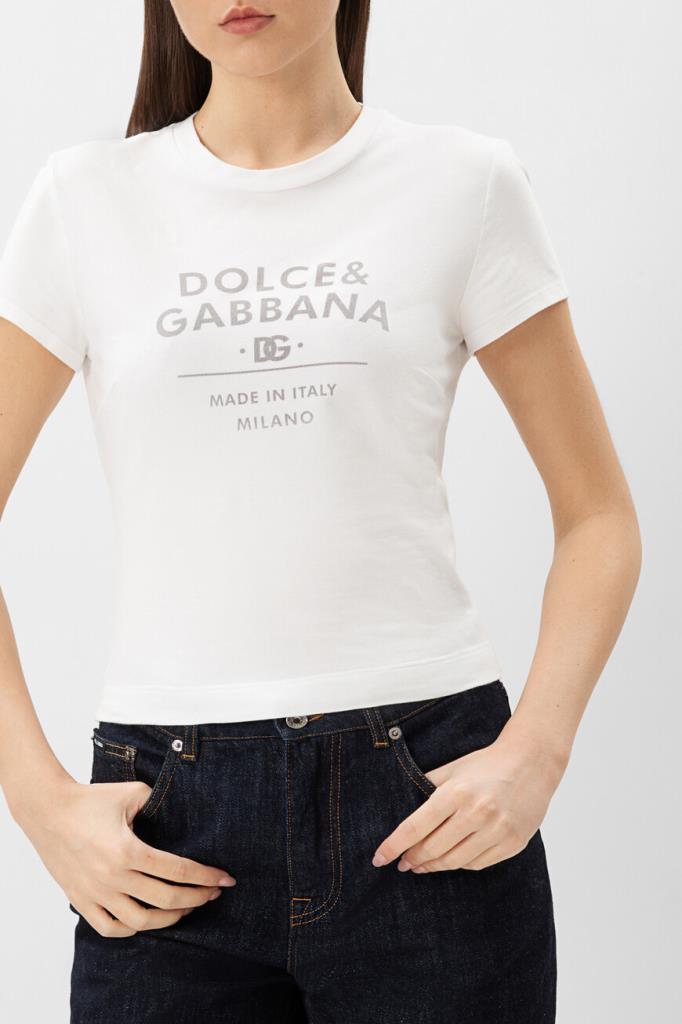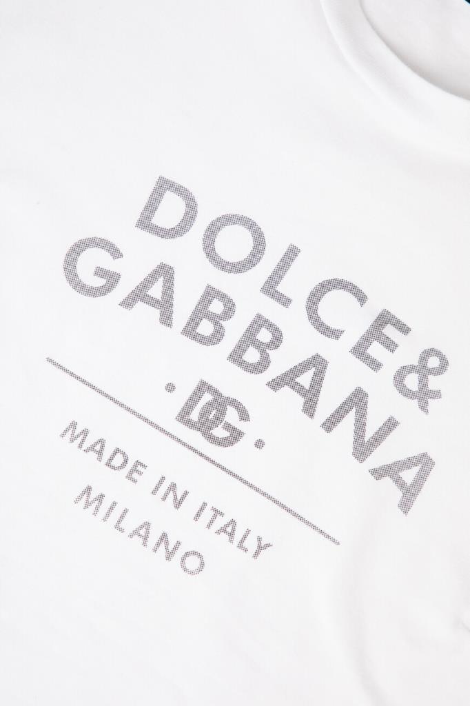 Белая футболка Dolce&Gabbana с фирменной надписью на груди. Минималистичная модель выполнена из хлопка с добавлением спандекса, который позволяет ткани хорошо тянуться и сохранять форму. Графический принт серого оттенка сообщает происхождение изделия. Футболка станет хорошей базой для образа в стиле спорт-шик.