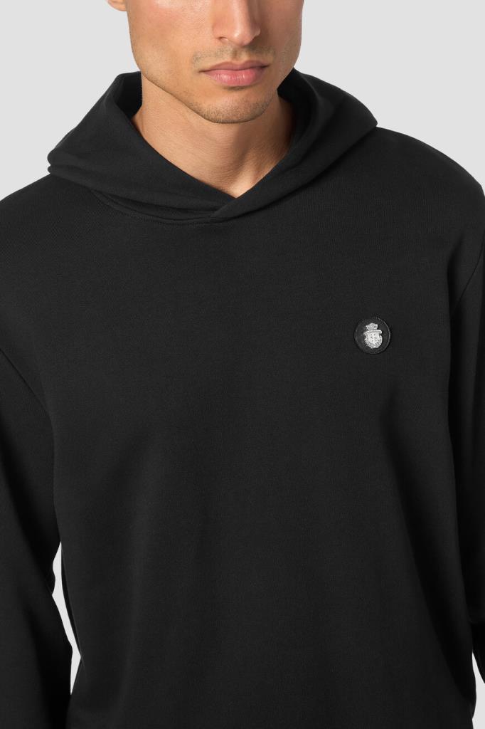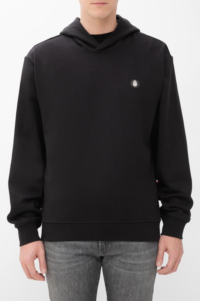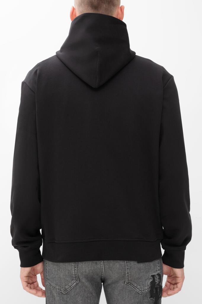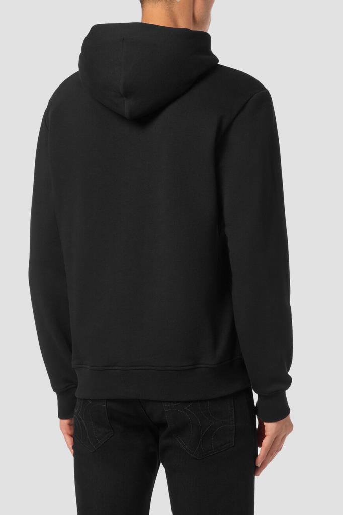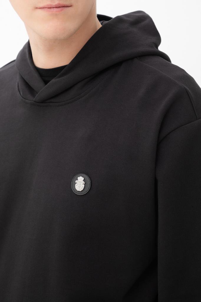 Худи из мягкого хлопкового флиса от Billionaire. Материал поддерживает комфортную для тела температуру и не сковывает движения. Изделие чёрного цвета характеризуется прямым силуэтом и наличием глубокого капюшона. О принадлежности модели Дому напоминает вставка с серебристым металлическим гербом, расположенная слева на груди. Образ можно дополнить джинсами с дизайнерскими потёртостями из той же коллекции.