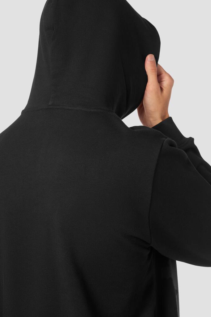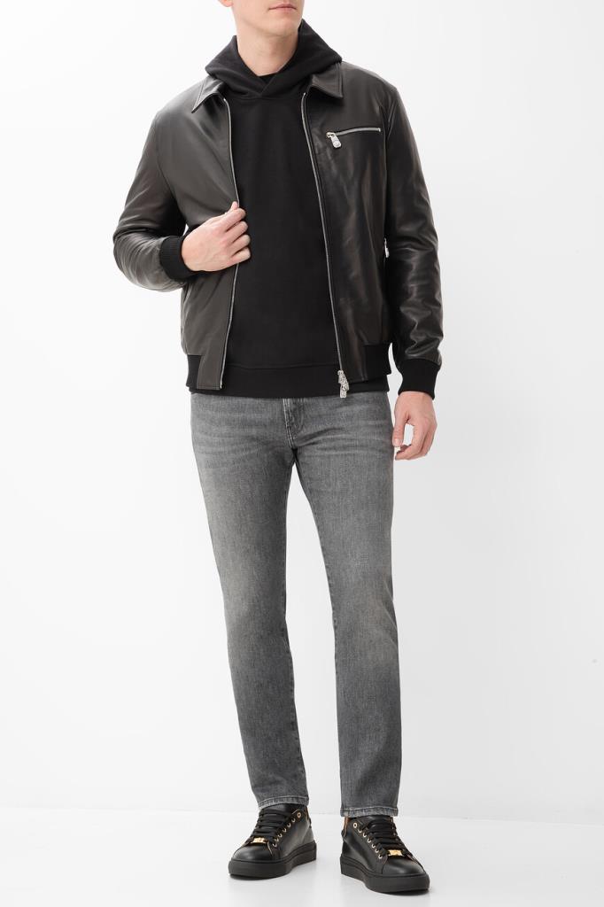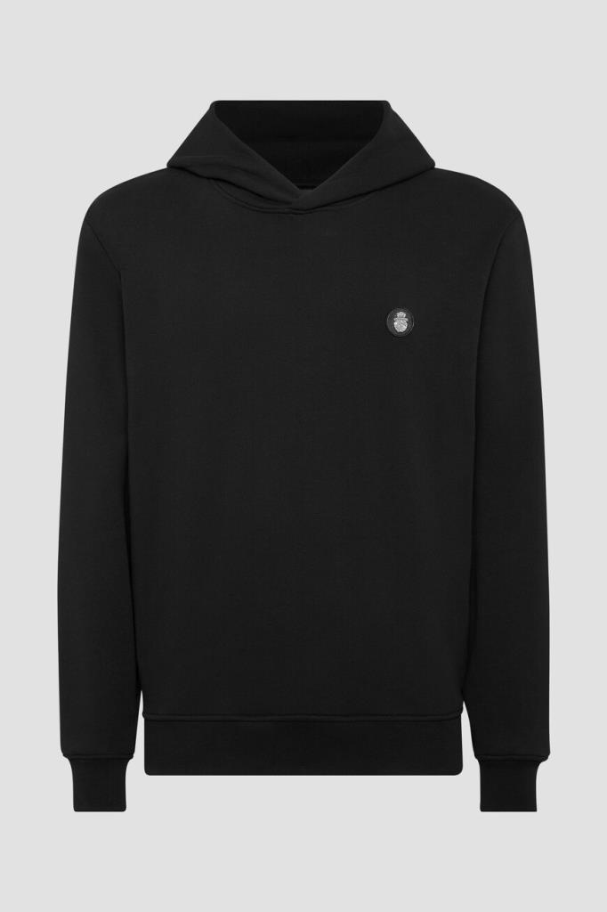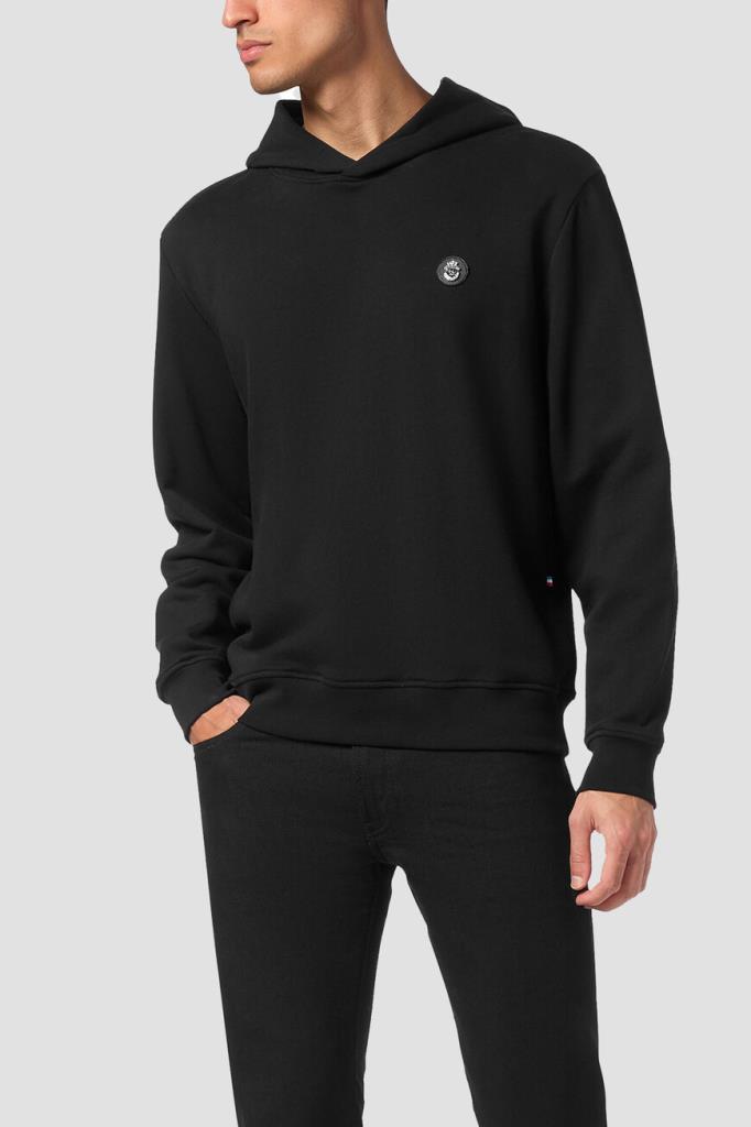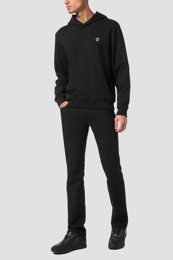 Худи из мягкого хлопкового флиса от Billionaire. Материал поддерживает комфортную для тела температуру и не сковывает движения. Изделие чёрного цвета характеризуется прямым силуэтом и наличием глубокого капюшона. О принадлежности модели Дому напоминает вставка с серебристым металлическим гербом, расположенная слева на груди. Образ можно дополнить джинсами с дизайнерскими потёртостями из той же коллекции.