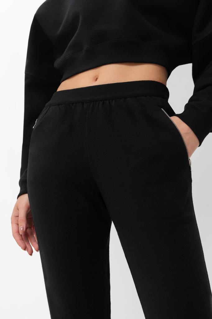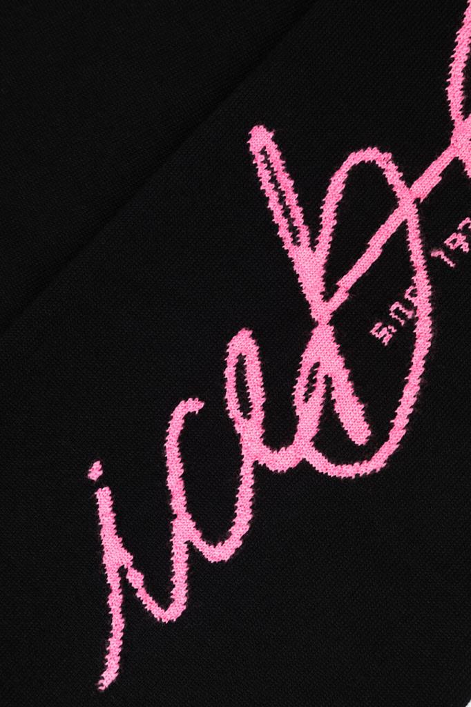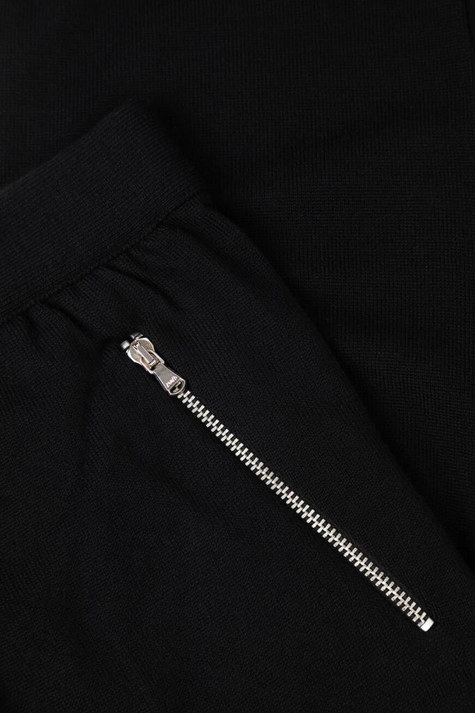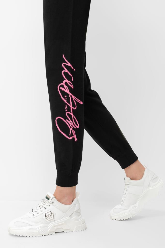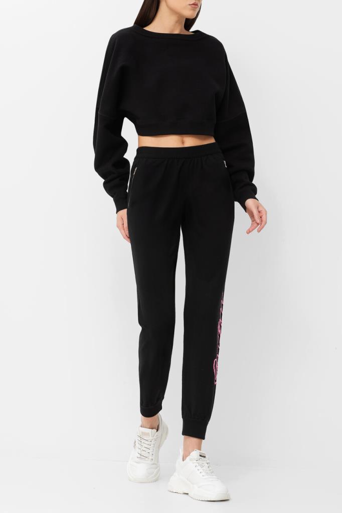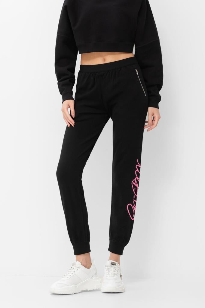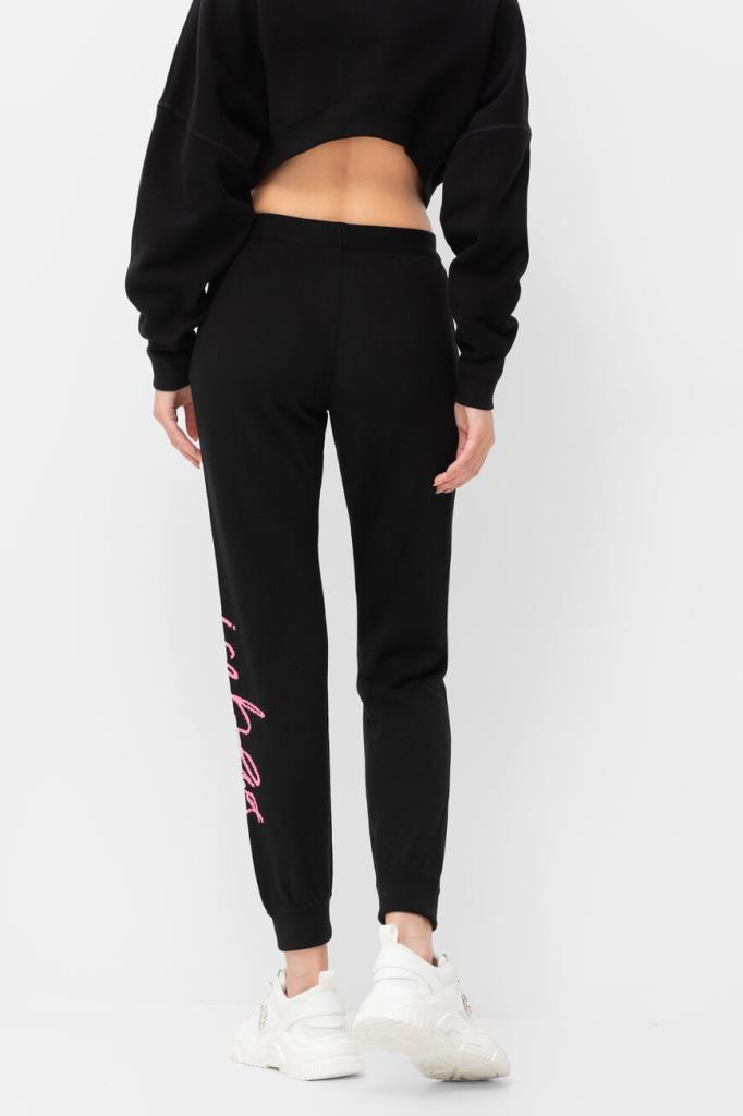 Джоггеры из деликатной шерсти virgin от бренда ICEBERG. Изделие средней посадки выполнено в чёрном цвете и дополнено двумя прорезными карманами на серебристой молнии по бокам. Комфорт и удобство в носке обеспечивают эластичный пояс и манжеты, подобранные на резинку. Декором выступают розовые дизайнерская надпись и год основания Дома сбоку на левой брючине.