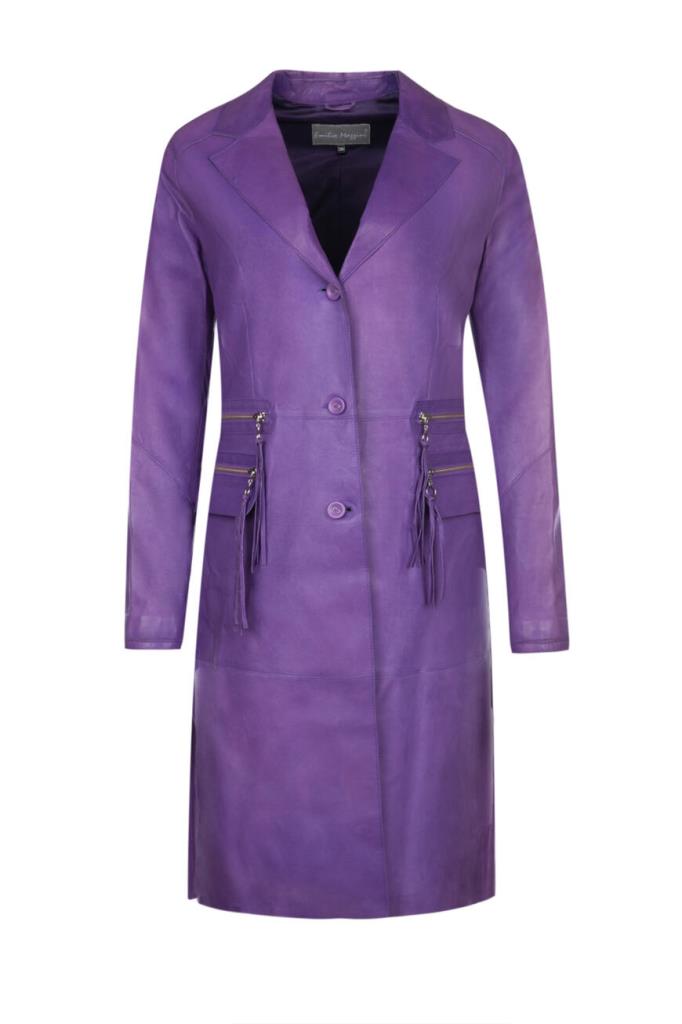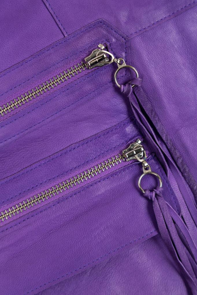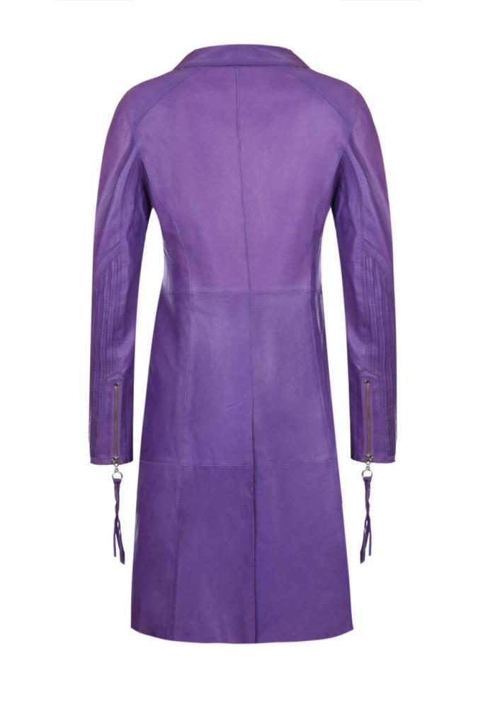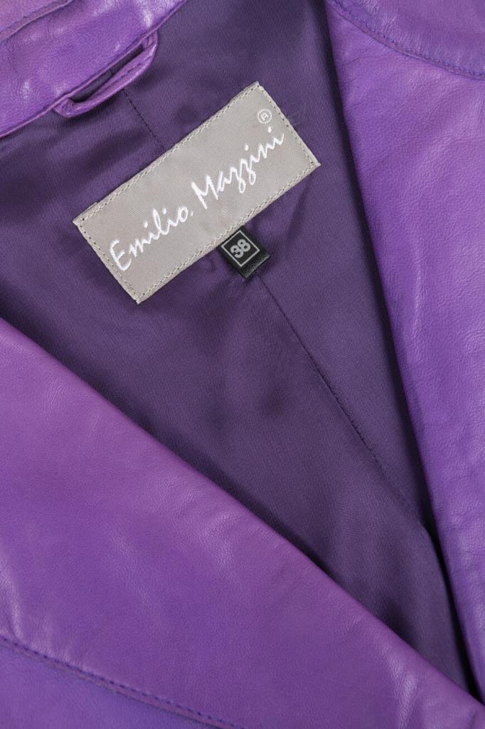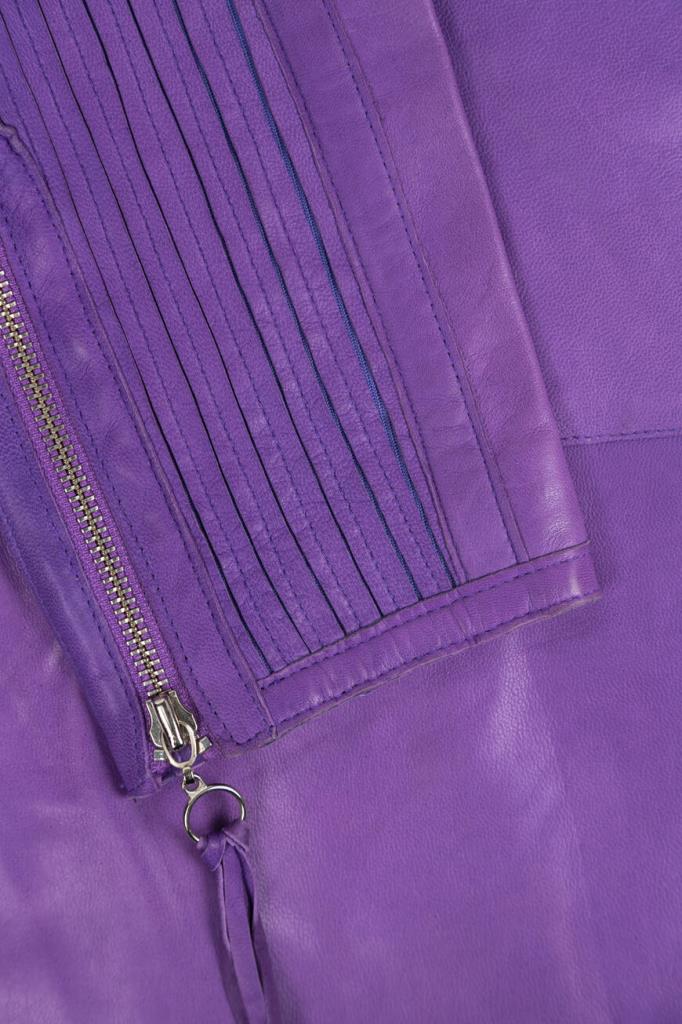 Эффектное женское пальто-френч от бренда Podium выполнено из мягкой натуральной телячьей кожи изысканного насыщенного фиолетового оттенка и дополнено оригинальными стёгаными вставками в виде рельефных полос сзади на рукавах на уровне локтя и ниже.