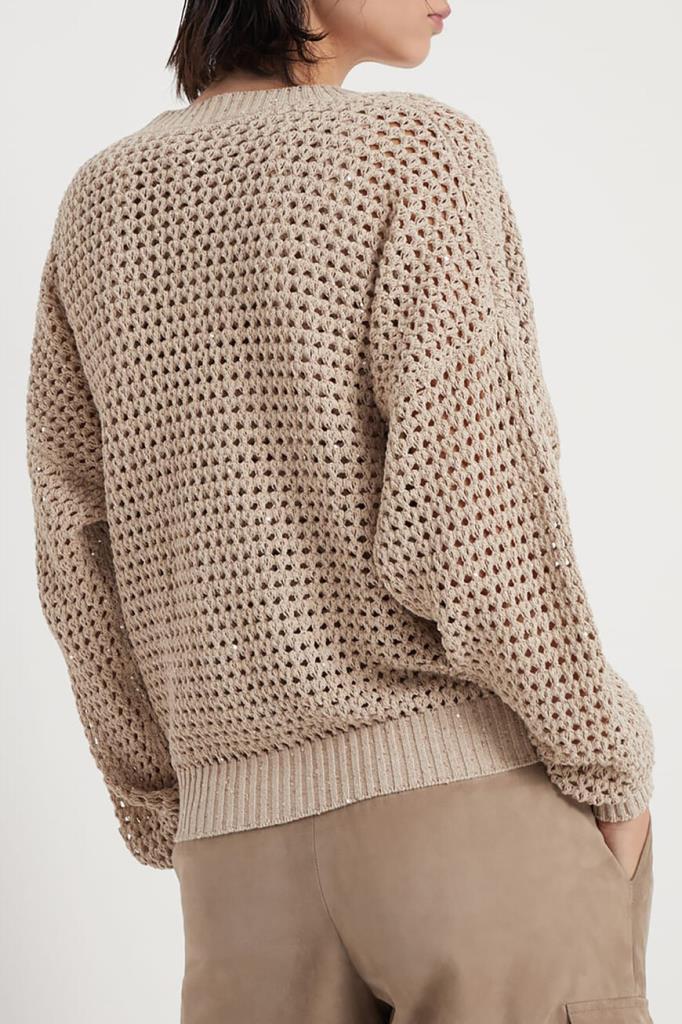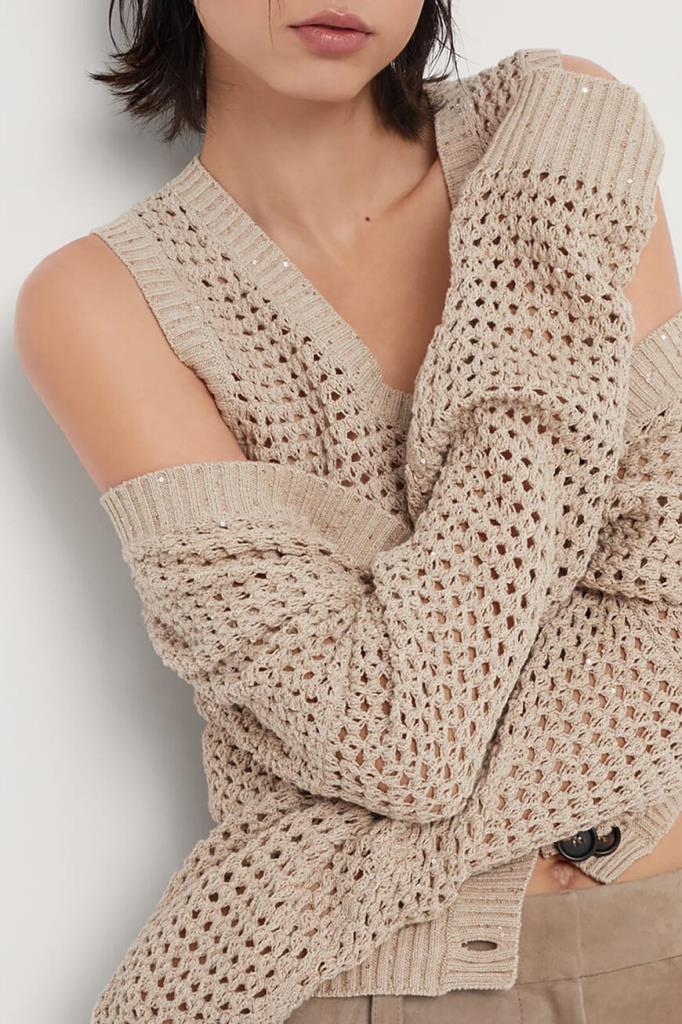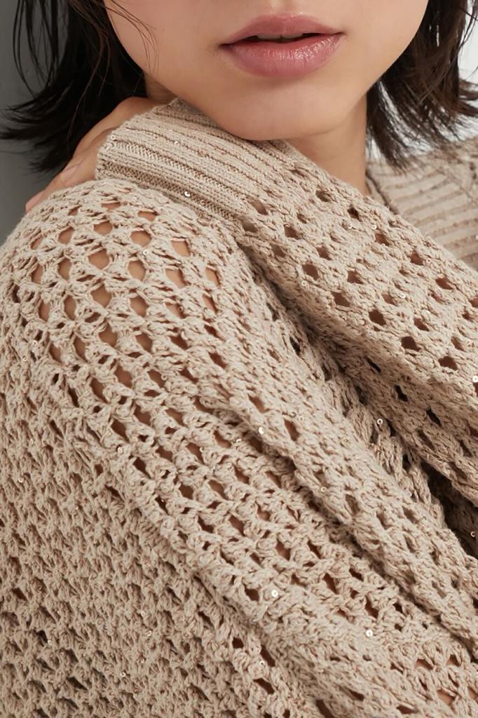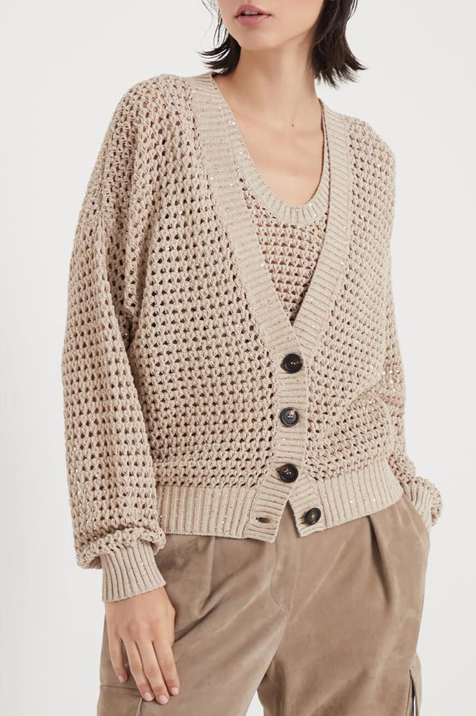 Вязаный кардиган Dazzling Net свободного кроя от BRUNELLO CUCINELLI. Модель изготовлена из лёгкой дышащей пряжи Diamante на основе хлопка и полиэфира с ажурным узором, создающим на поверхности изысканный трёхмерный эффект. Отличительной особенностью изделия стали переливающиеся сияющие пайетки. Традиционная трикотажная отделка и женственные детали определяют стиль кардигана, идеально подходящего для тёплого сезона.