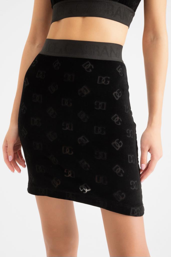 Брендированная юбка-карандаш чёрного цвета от Dolce & Gabbana. Для пошива модели выбрано флокированное хлопковое джерси с жаккардовым принтом. Изделие садится точно по фигуре, мягко облегая бедра, и гармонично сочетается с хлопковым кроп-топом из той же коллекции.