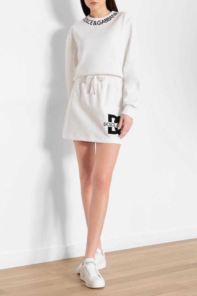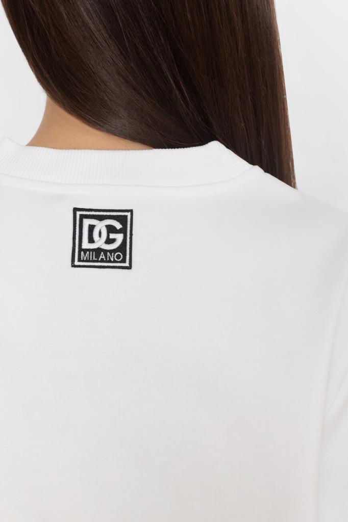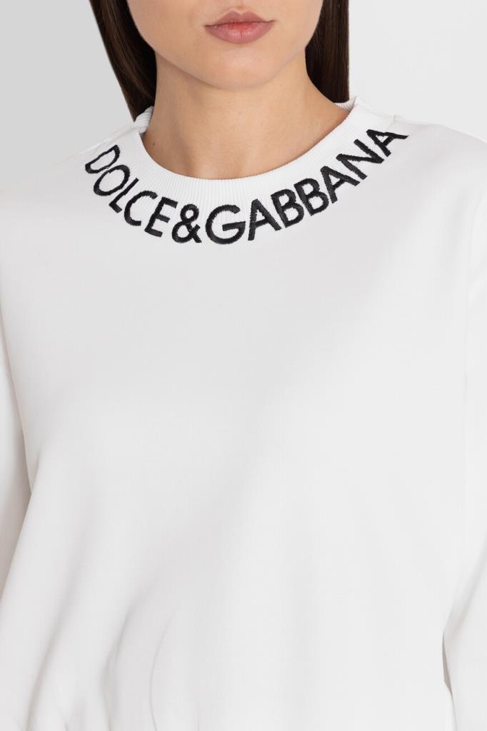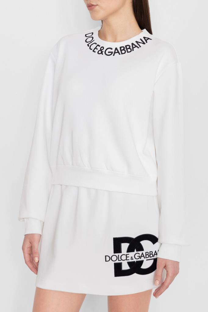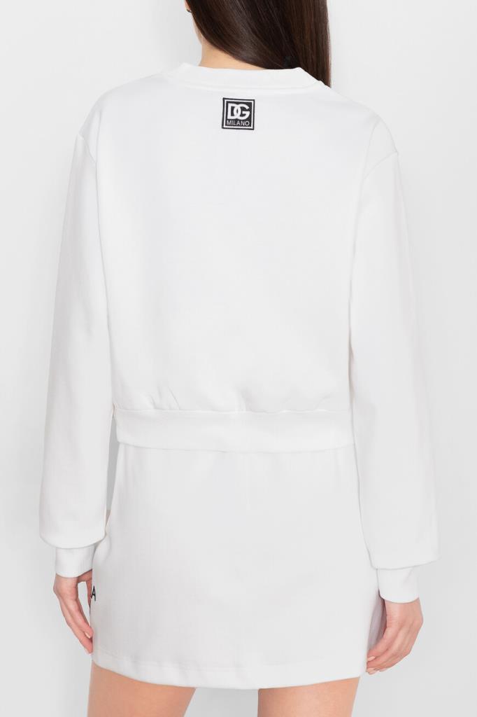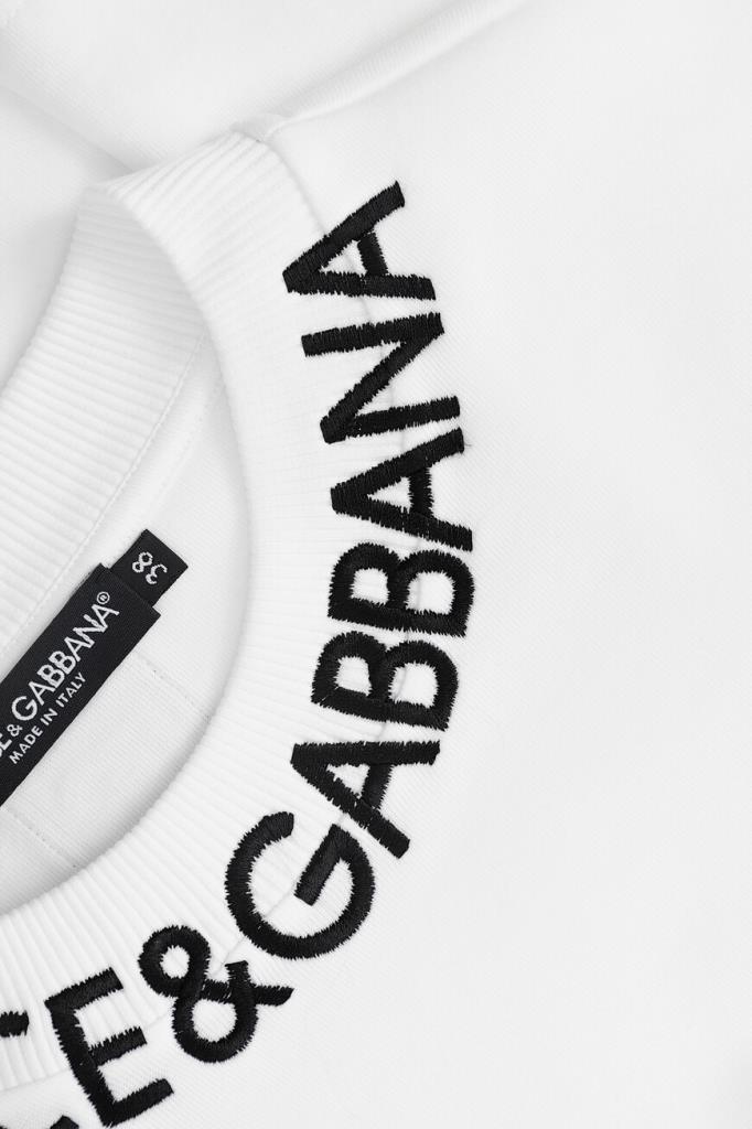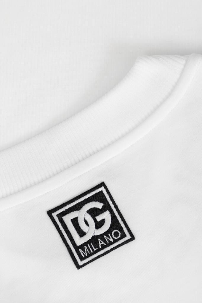 Белый свитшот прямого кроя с культовой символикой Dolce & Gabbana. Коллекция «Black Sicily» - это вневременной узнаваемый гардероб, в котором преобладают чёрный и оптический белый цвета. Для пошива укороченной модели выбрано мягкое джерси на основе хлопка и полиэфира. Контрастными акцентами стали крупный вышитый логотип спереди на воротнике и квадратная вставка-вышивка «DG MILANO» сзади. Изделие можно сочетать с юбкой с широким эластичным поясом-кулиской и кожаными сникерами Portofino того же бренда.