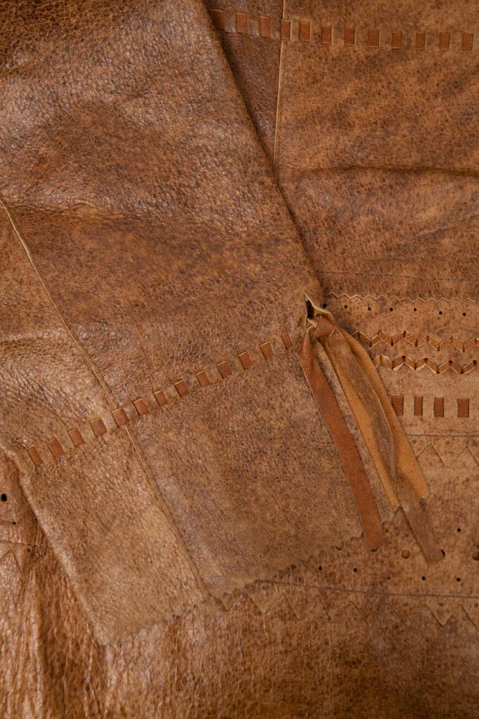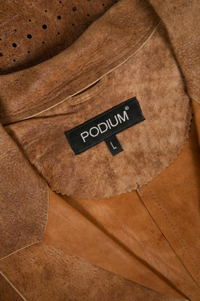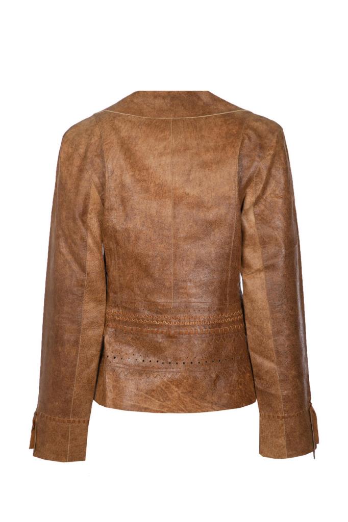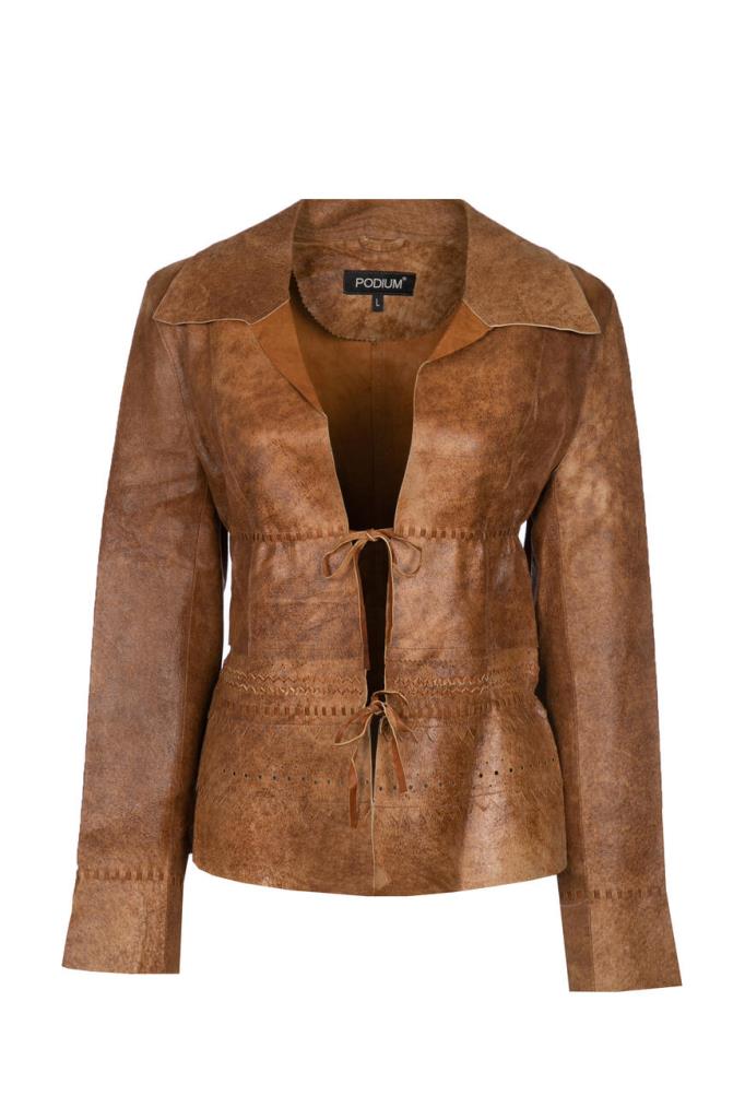 Роскошная женская куртка Podium из мягкой натуральной телячьей кожи коричневого оттенка с эффектным контрастным патинированным узором по всей поверхности изделия и оригинальными дизайнерскими завязками спереди (основная) и на рукавах (декор на манжетах сверху).