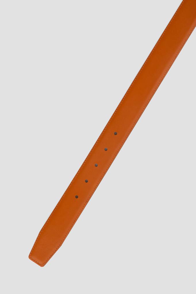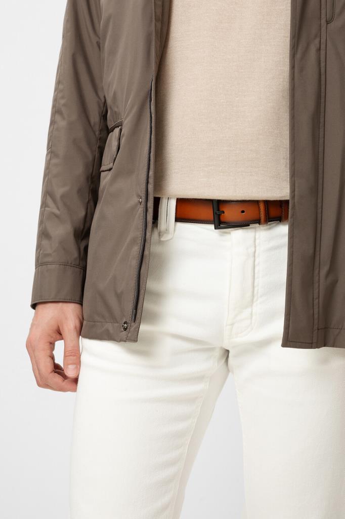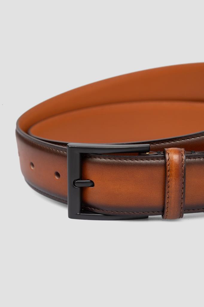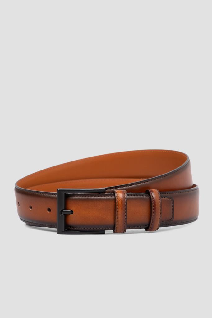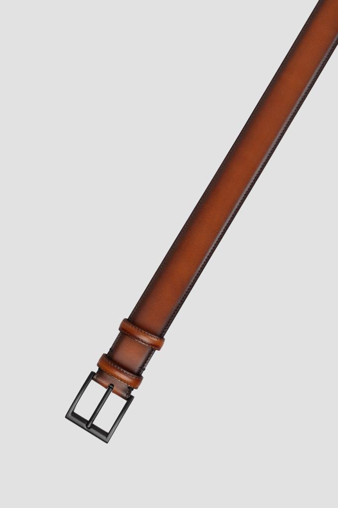 Кожаный ремень Fargoni коричневого оттенка с патиной. Изделие регулируется классической металлической пряжкой с язычком и отличается двумя подвижными тренчиками для фиксации наконечника. Прошитая по краю модель средней ширины органично дополнит и формальные брюки, и джинсы.