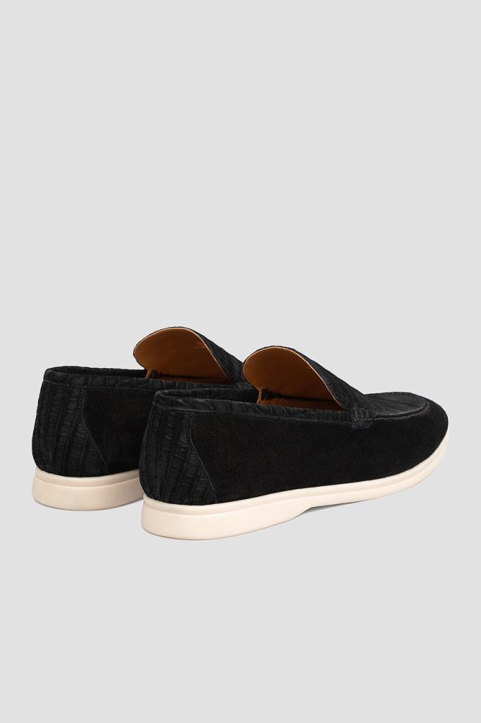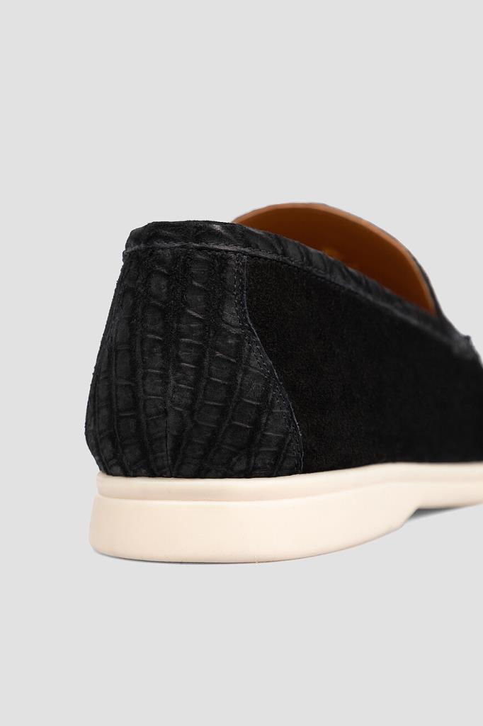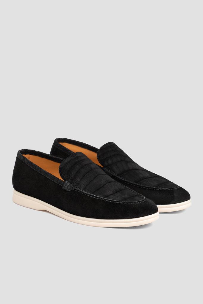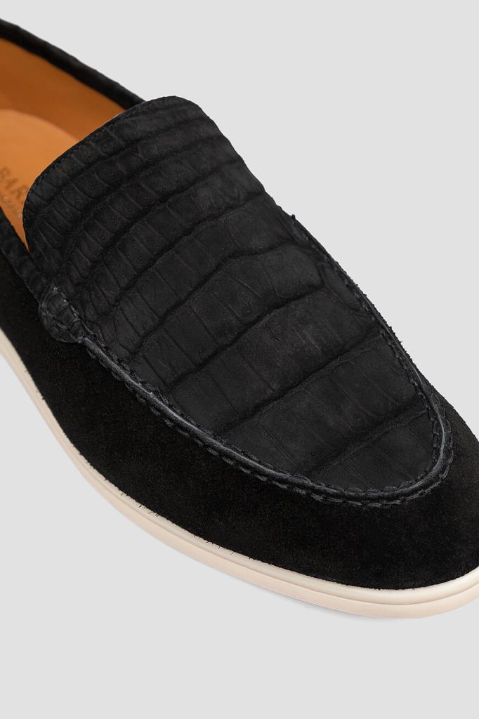 Чёрные лоферы Bardini с брендированными кожаными стельками. Для создания модели ручной работы выбрана мягкая бархатистая замша со вставками из фактурной матовой кожи нильского крокодила на мыске, сверху (окантовка) и на заднике в тон. Подошва пришита к верхней замшевой части пары швом Гудиер, обеспечивающим максимальную долговечность этому соединению.