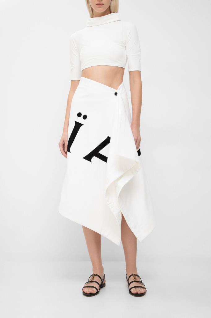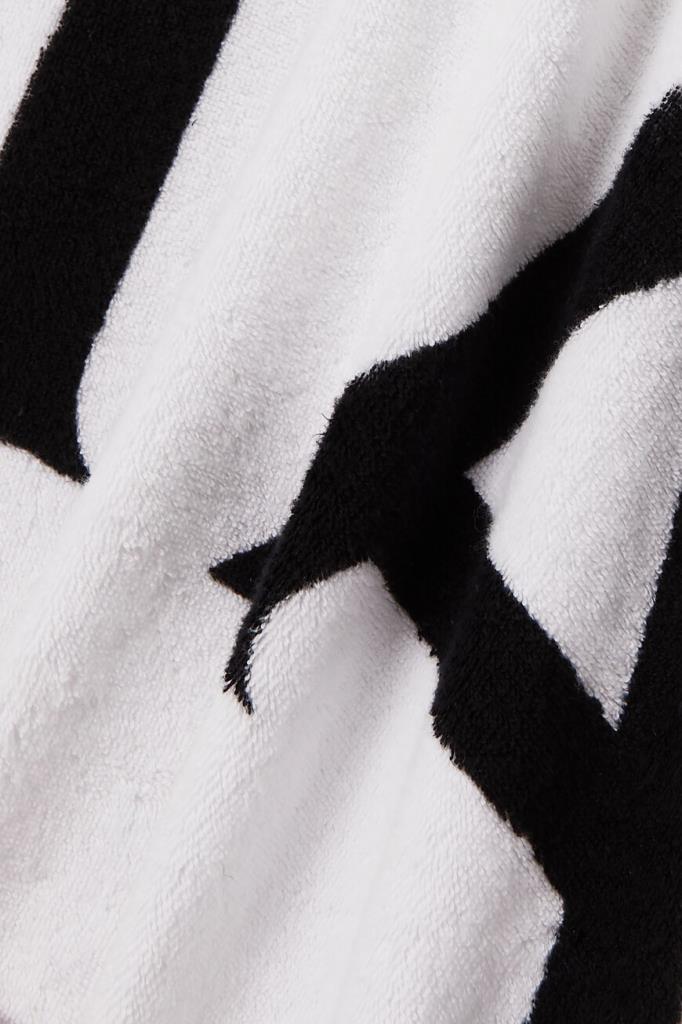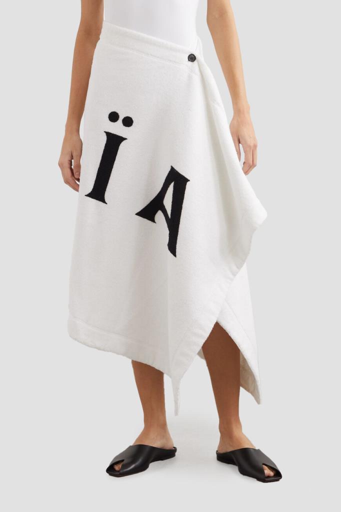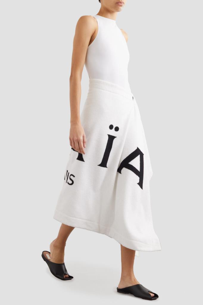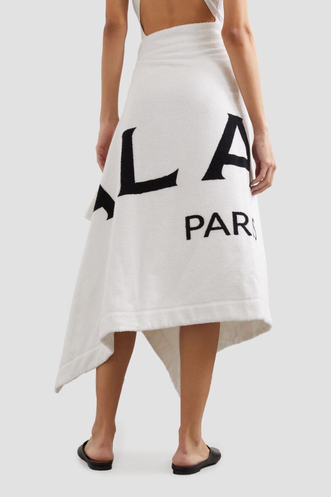 Юбка-полотенце из мягкой махровой ткани от бренда ALAIA. Изделие выполнено на основе хлопка белого цвета с ворсистой поверхностью. Модель оборачивается вокруг талии, застёгивается на роговую пуговицу контрастного оттенка и отличается ниспадающими складками сбоку слева. О принадлежности ассиметричного парео Дому напоминает крупная знаковая символика - логотип чёрного цвета посередине. Изделие станет идеальным завершение образа с трикини из той же коллекции.