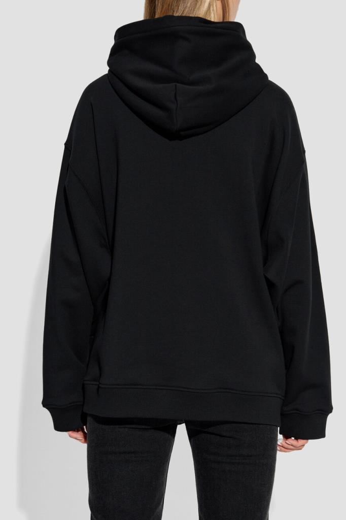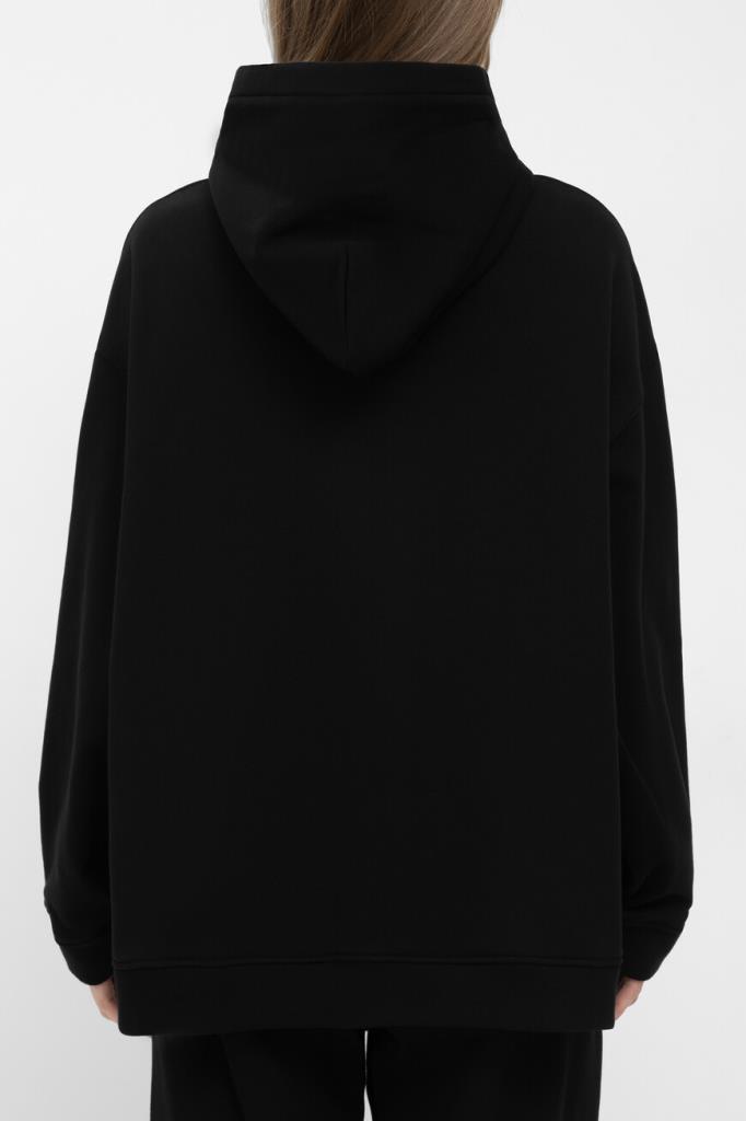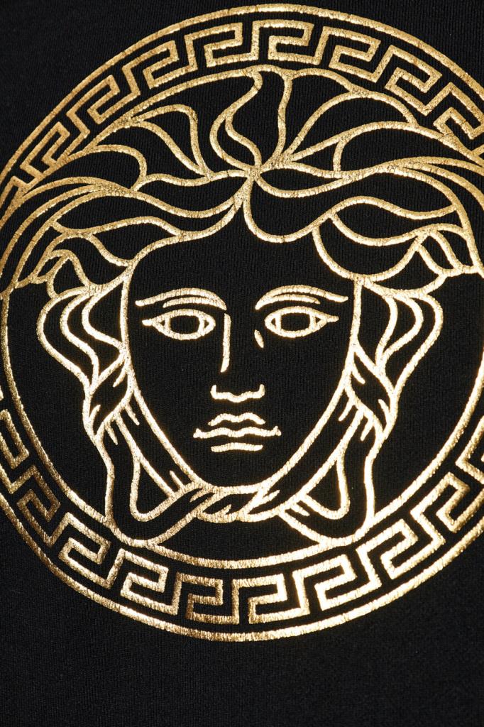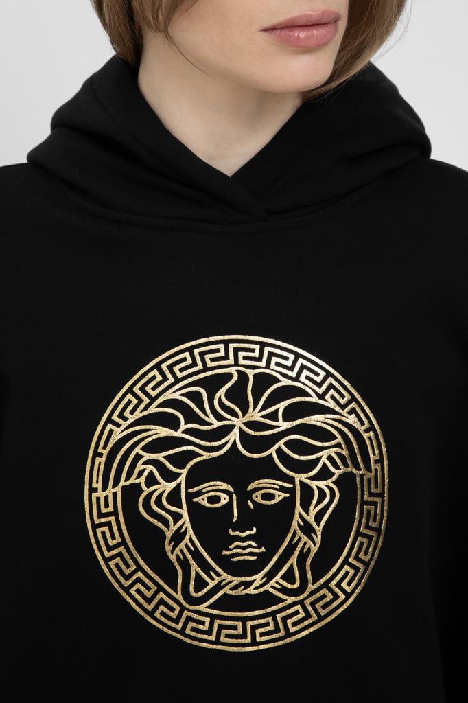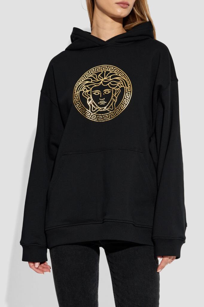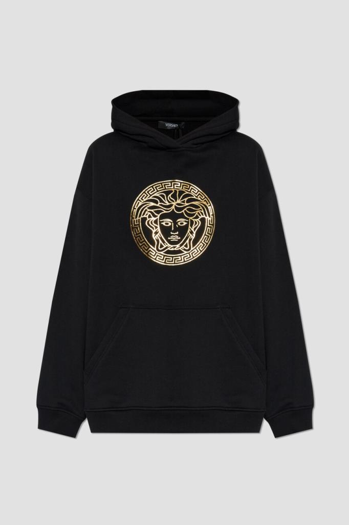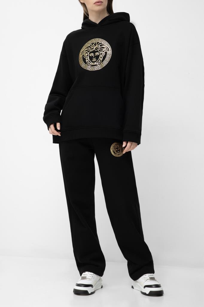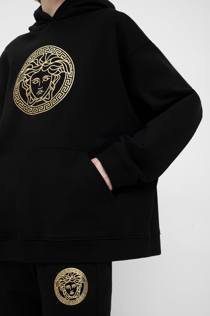 Чёрное худи оверсайз от VERSACE. Фасон изделия, сшитого из мягкого хлопкового трикотажа, предполагает глубокий капюшон и крупный карман-кенгуру. В качестве знакового декора выступает золотистая вышивка в виде головы Горгоны Медузы, расположенная спереди. Модель выполненная в городском стиле, обеспечивает защиту в прохладные дни и сочетается с парными джоггерами и стёганой курткой прилегающего силуэта из той же коллекции.