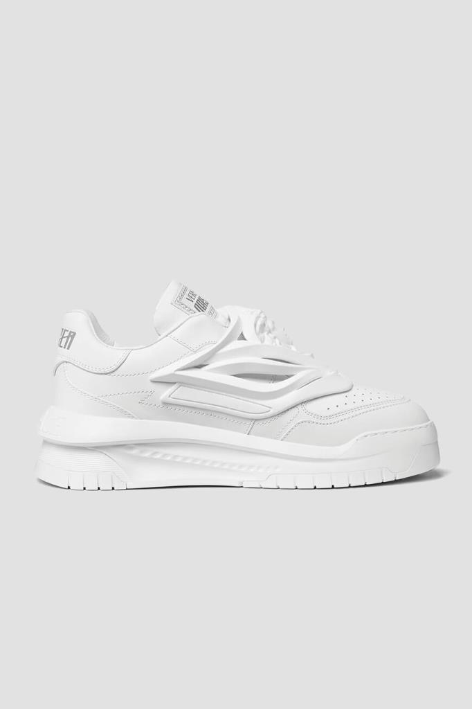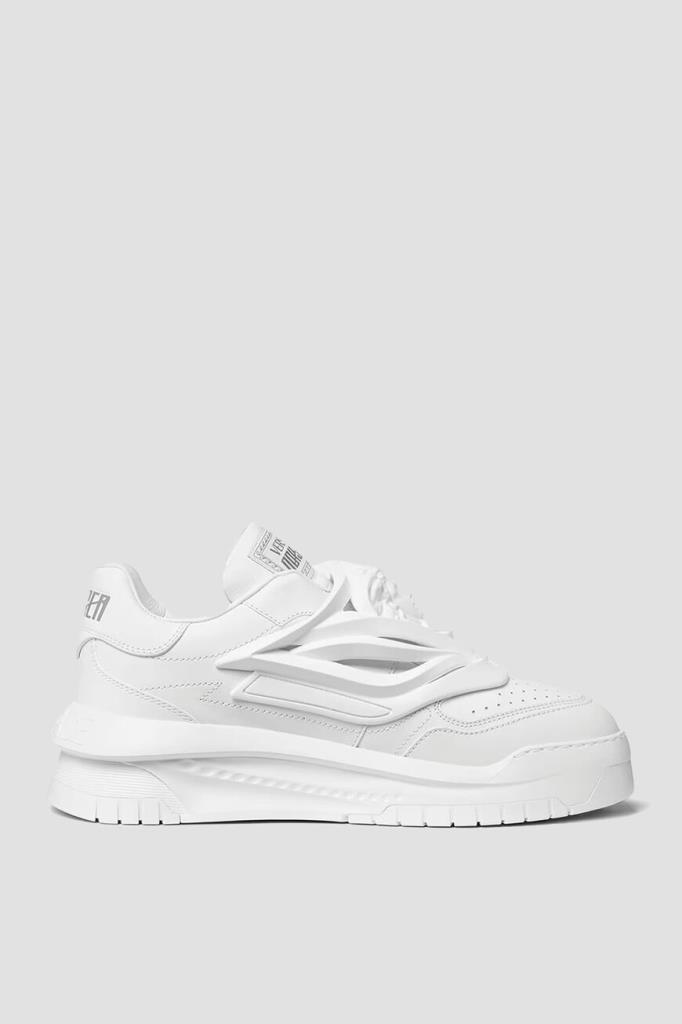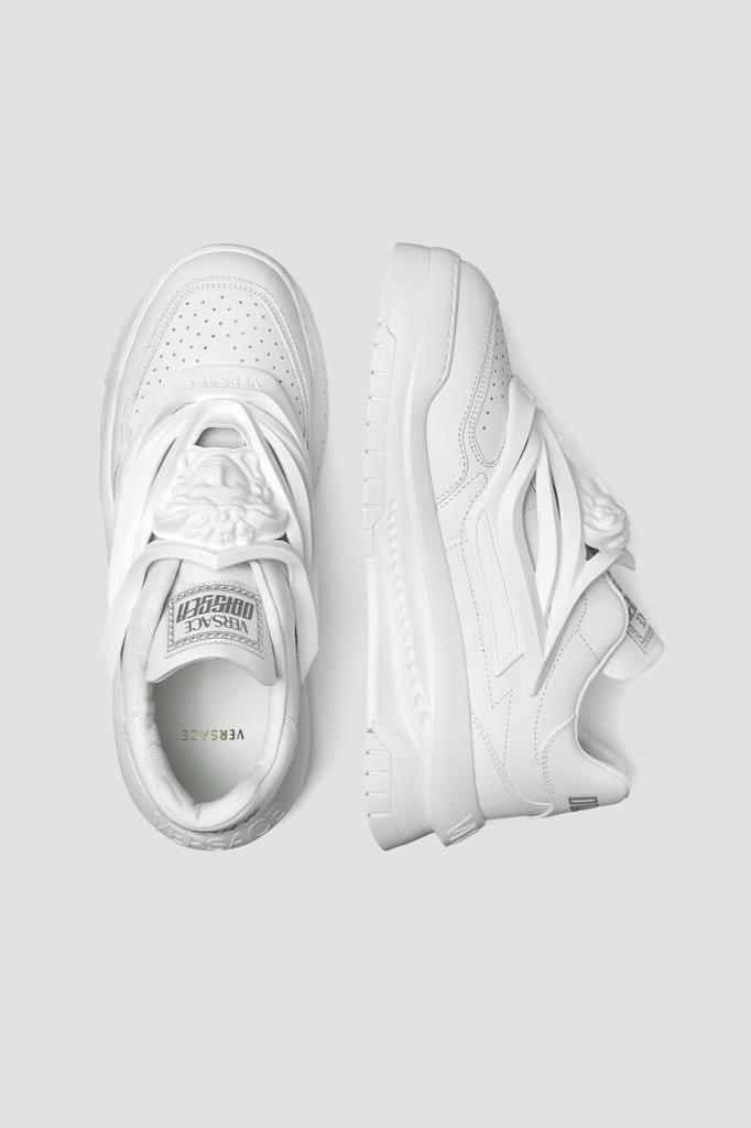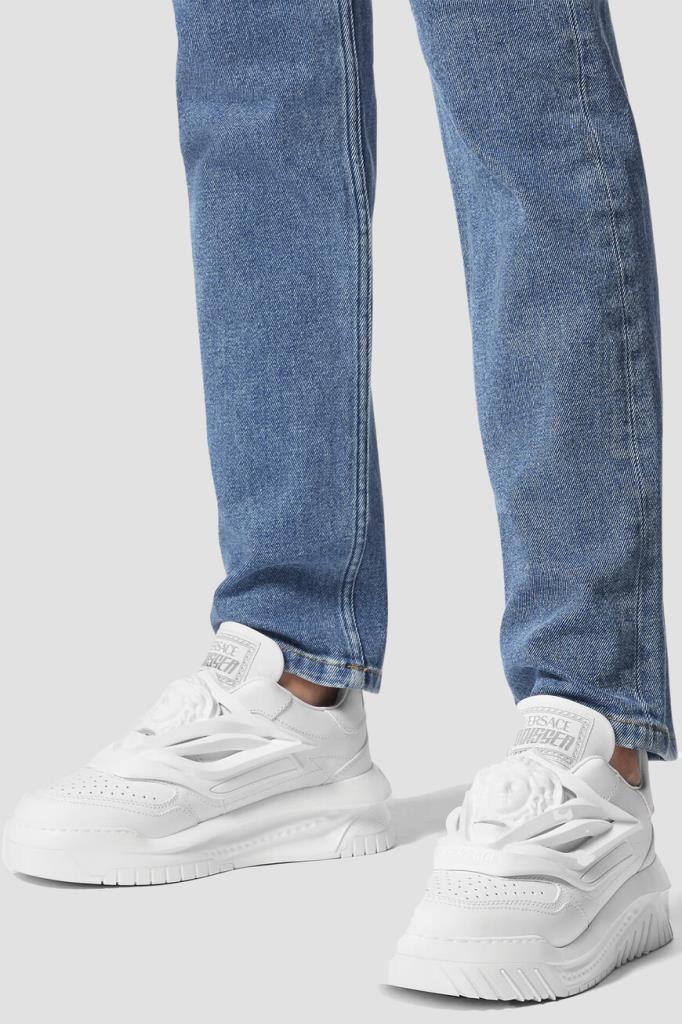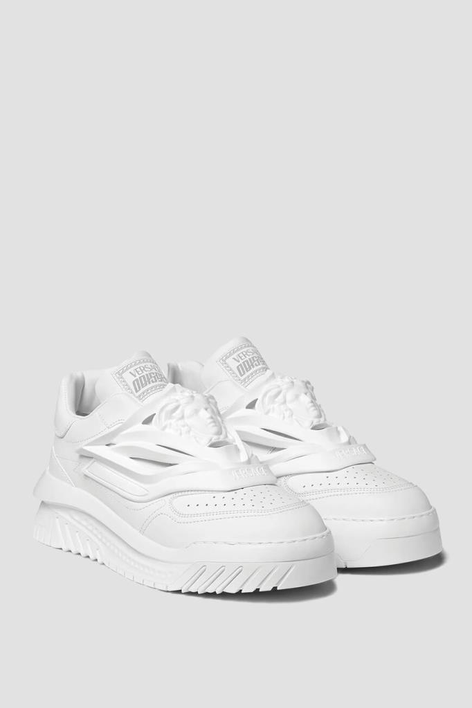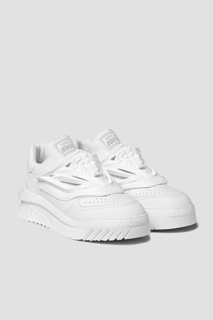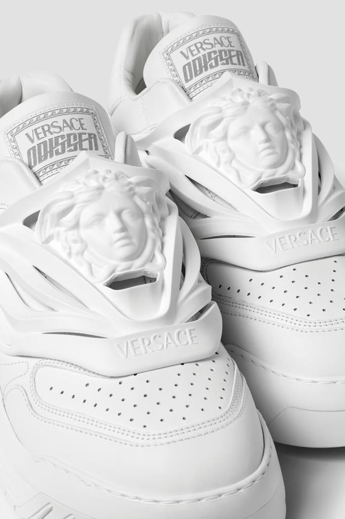 Белые сникеры Odissea от VERSACE. Удобная пара с футуристическим и динамичным дизайном изготовлена из мягкой телячьей кожи с гладкой текстурой. Лёгкая модель отличается перфорацией на носке и скульптурной прорезиненной деталью La Medusa с трёхмерным эффектом спереди. Атрибутами Дома также являются лейбл с логотипом и надписью-названием модели на язычке, надпись «Odissea» сзади и рельефные лого спереди и на заднике. Обувь без шнуровки станет идеальным дополнением Вашего образа.