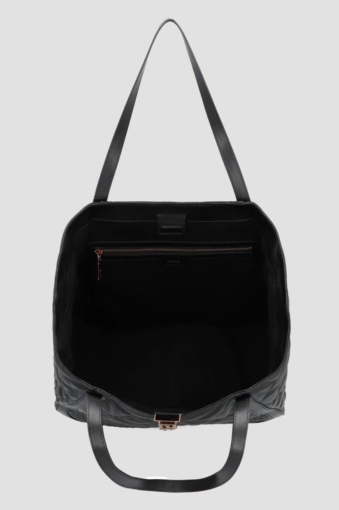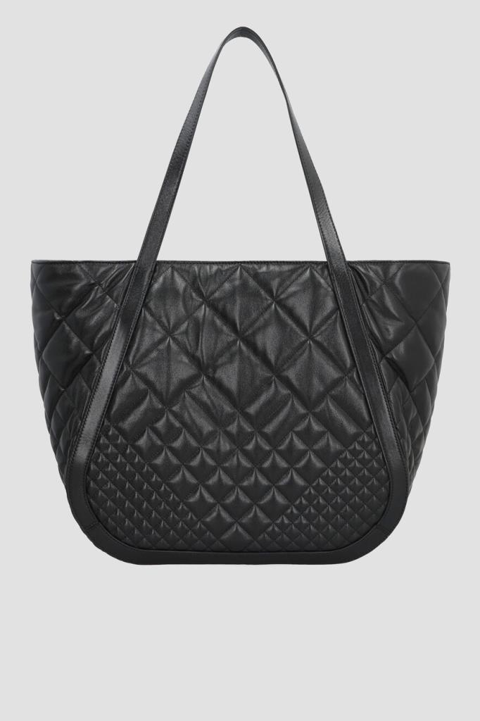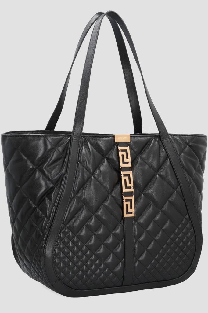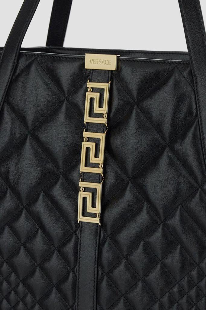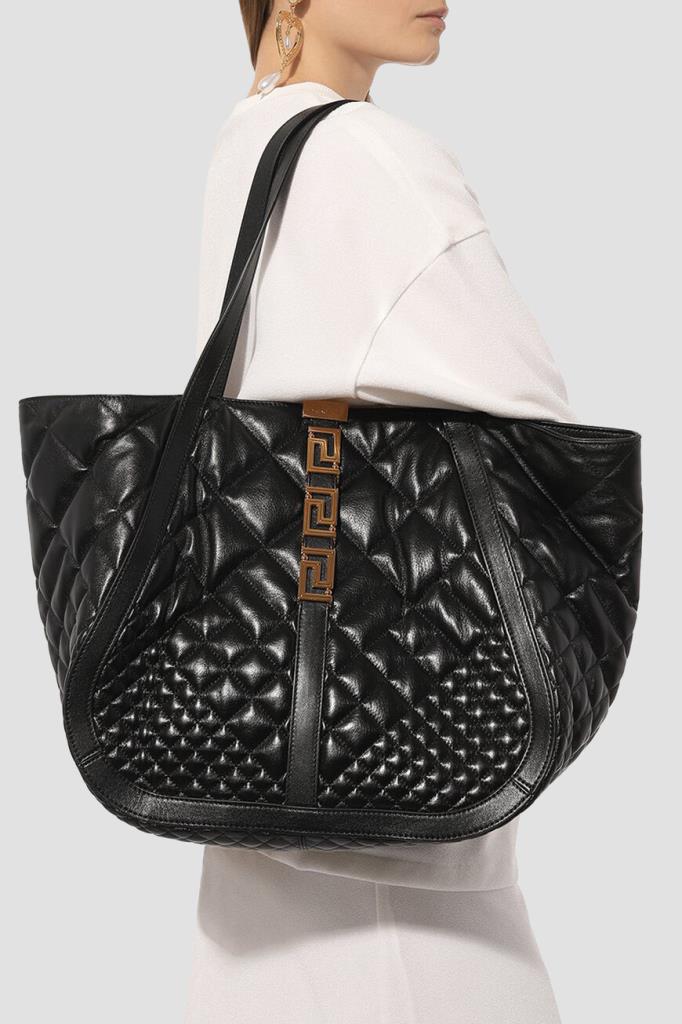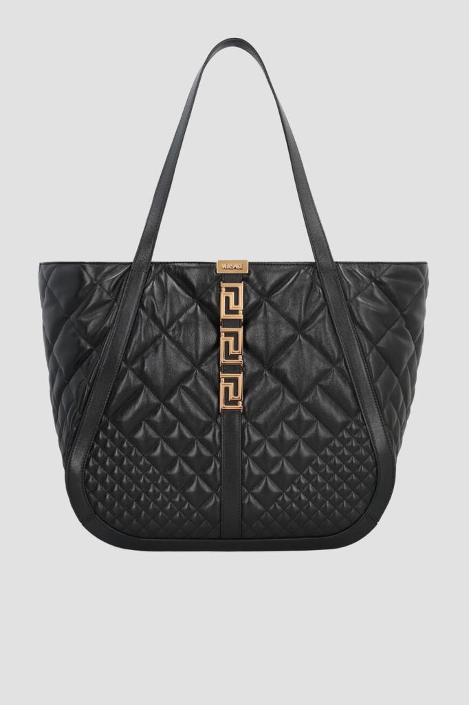 Стёганая сумка-тоут Greca Goddess от VERSACE. Для создания вместительного аксессуара используется чёрная телячья кожа. Модель-трапеция декорирована спереди полосой с меандровым узором - золотистой металлической фурнитурой Greca. Изделие с брендированной прямоугольной застёжкой на потайной магнит оснащено длинными округлыми ручками для переноски и дополнено одним вместительным внутренним отделением.