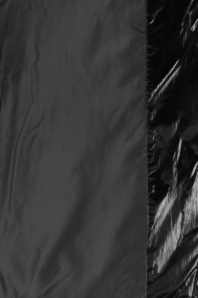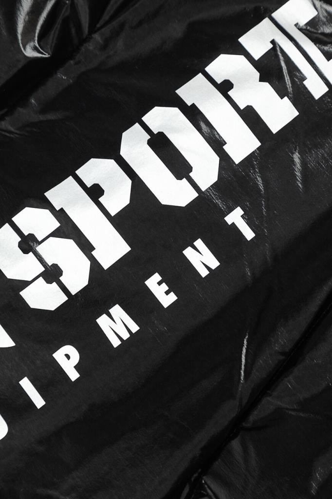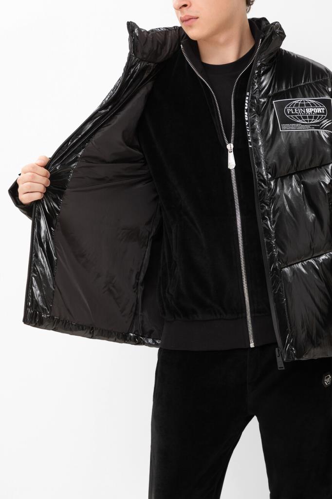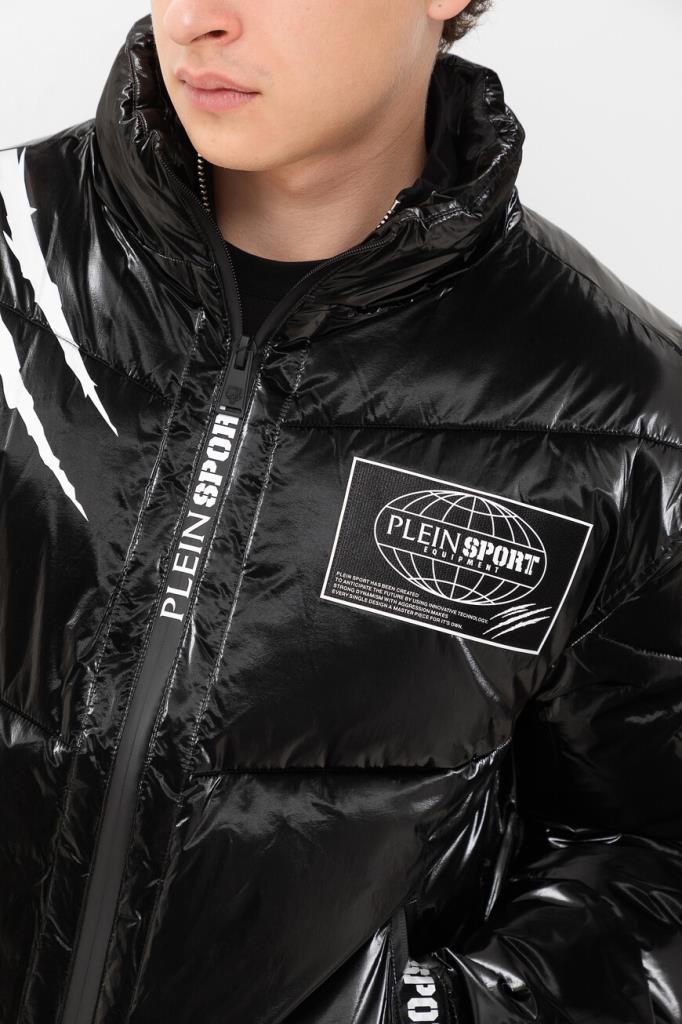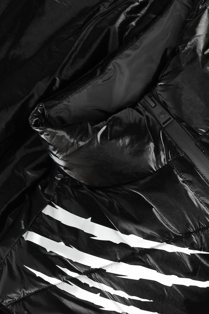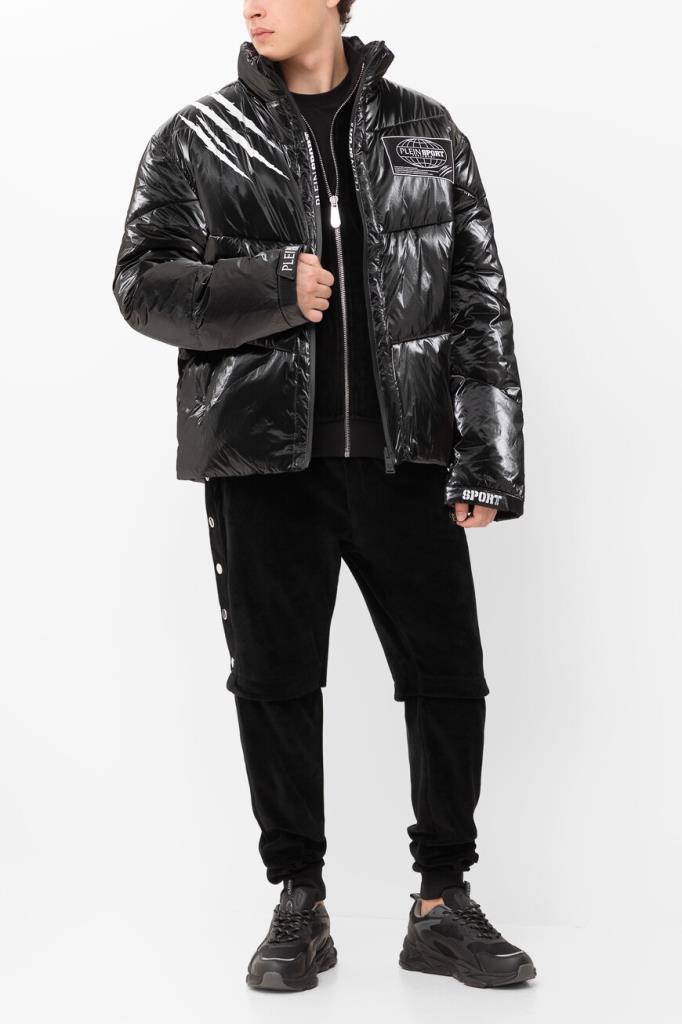 Чёрный пуховик на молнии с матовой отделкой от PLEIN Sport. Для изготовления модели прямого силуэта выбран стёганый нейлон. Отличительными особенностями изделия стали принт с изображением следов от когтей тигра, прямоугольная вставка с символикой Дома слева на груди и крупная надпись-логотип на спинке. Высокий воротник-стойка обеспечивает надёжную защиту от порывов ветра, а манжеты рукавов, обрамлённые брендированными надписями спереди, завершают дизайн пуховика знаковой нотой.