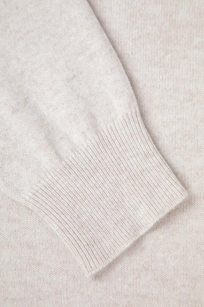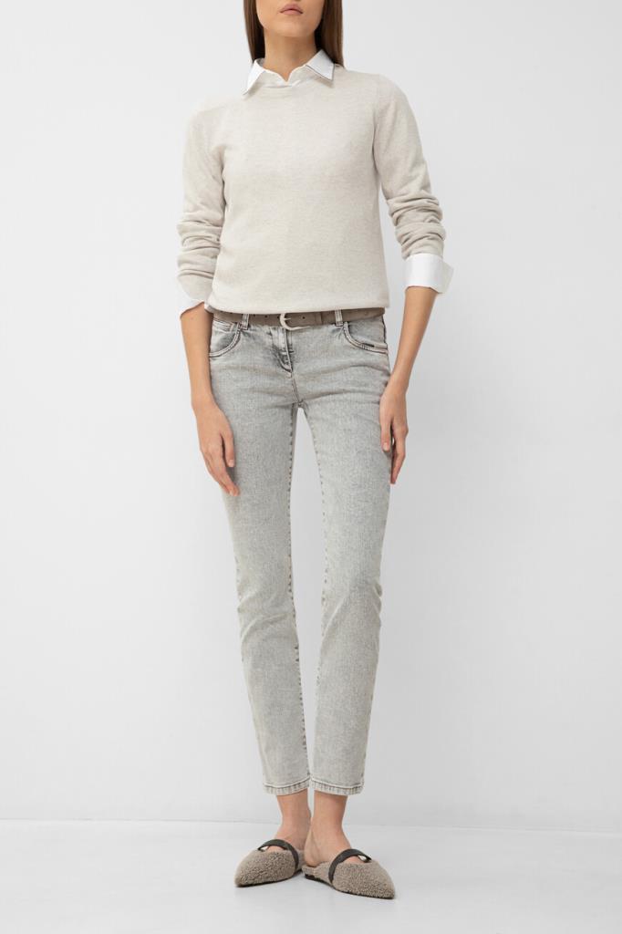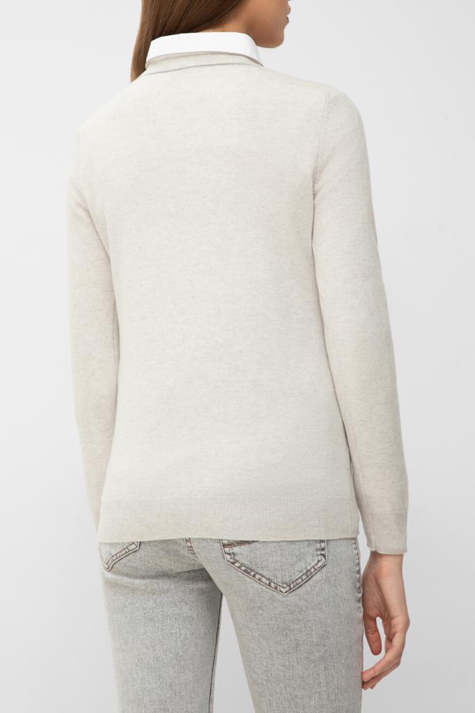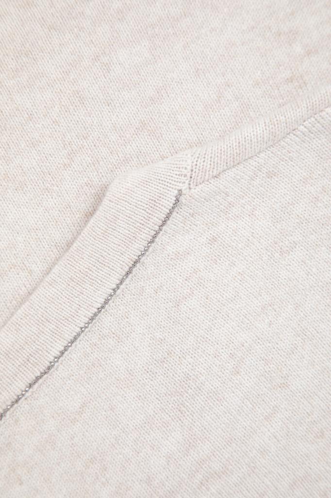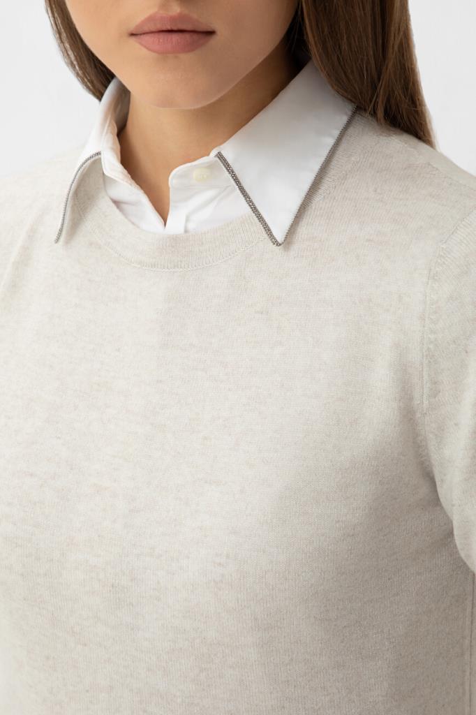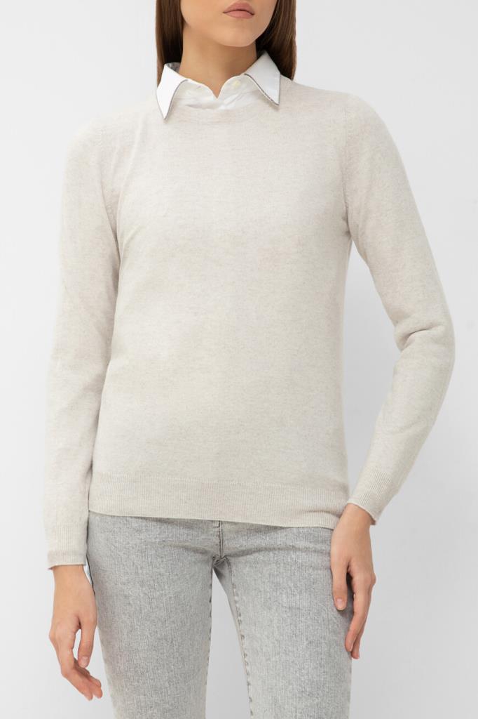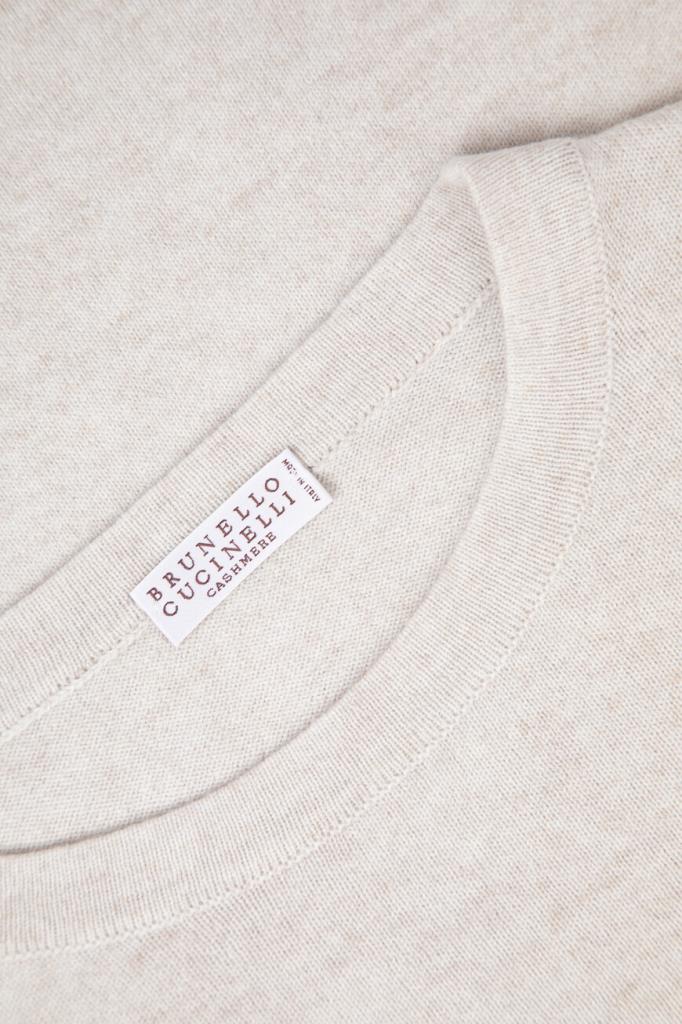 Свитер полуприлегающего силуэта от BRUNELLO CUCINELLI. Нейтральный оттенок и минималистичный декор делают модель универсальным решением в гардеробе. Тонкий трикотаж, связанный из почти невесомого нежного кашемира, исключительно приятно ощущается на коже и поддерживает оптимальную температуру, поэтому в изделии будет комфортно на улице в прохладный день и нежарко в тёплом помещении. Круглый вырез горловины сзади деликатно акцентирован серебристой цепочкой Мониль. Свитер можно носить в комплекте с классической рубашкой из той же коллекции.