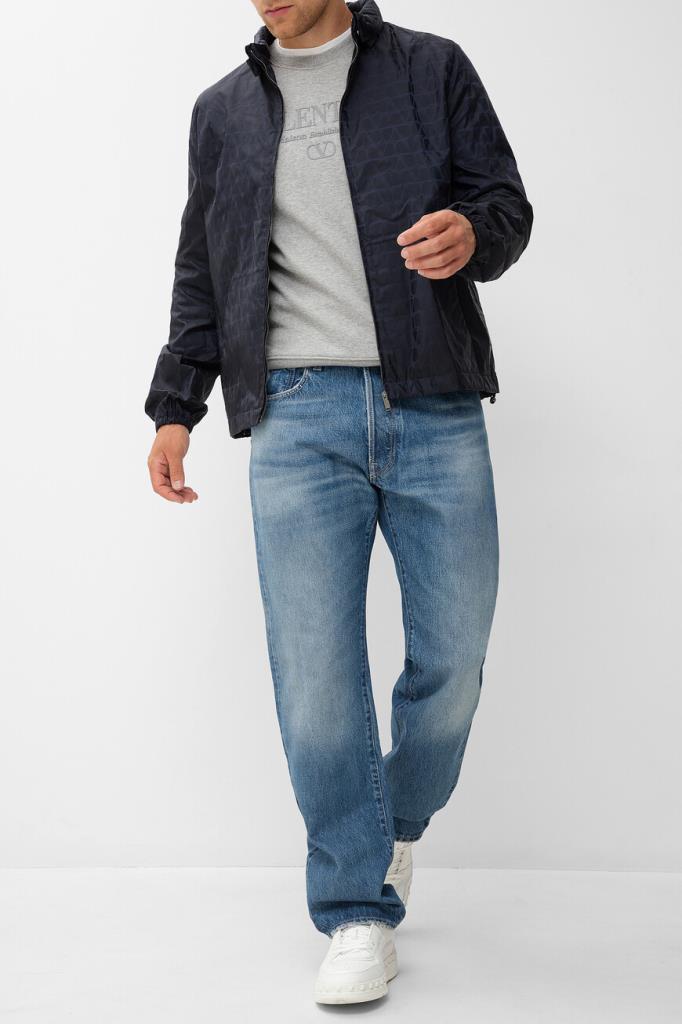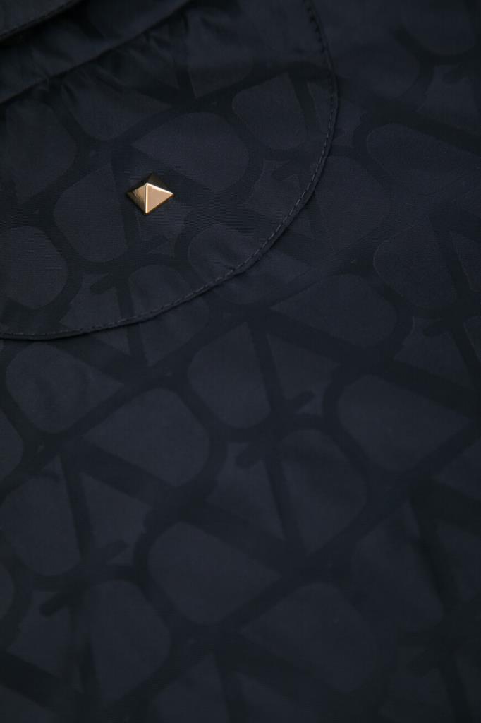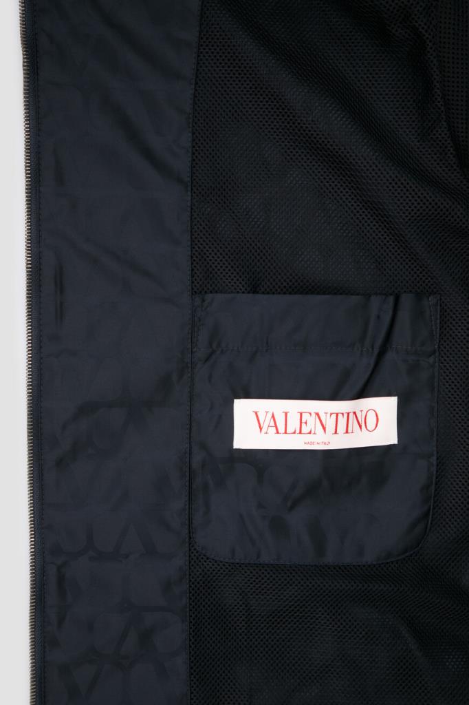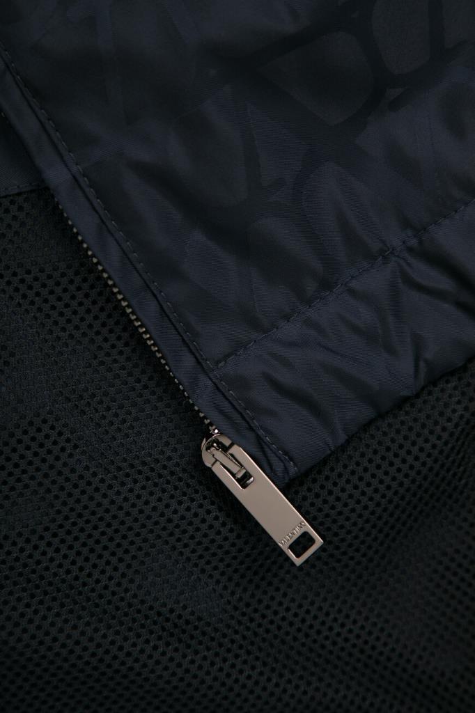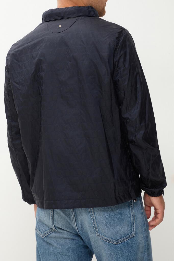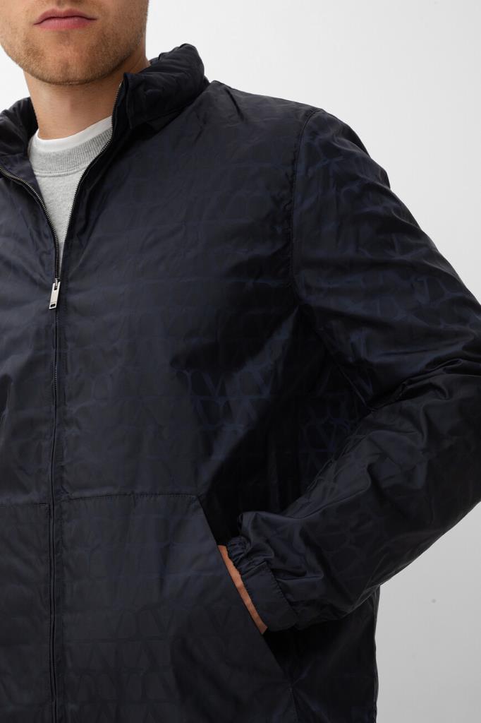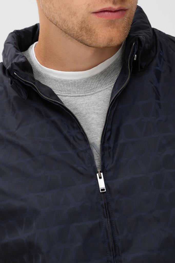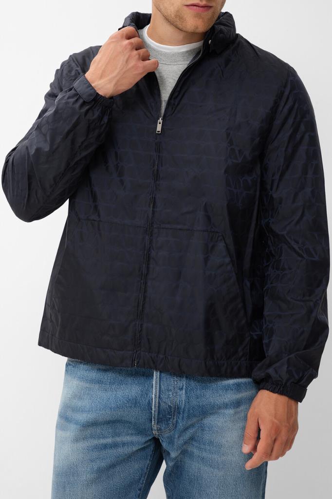 Принтованная куртка тёмно-синего цвета от бренда VALENTINO. Модель из прочного водоотталкивающего нейлона декорирована жаккардовым геометрическим мотивом в виде логотипа VLogo Signature. Комфорт и надёжную защиту от непогоды обеспечивают высокий воротник-стойка, который можно сложить вдвое и закрепить на потайные клёпки спереди, и манжеты рукавов, подобранные на резинку.