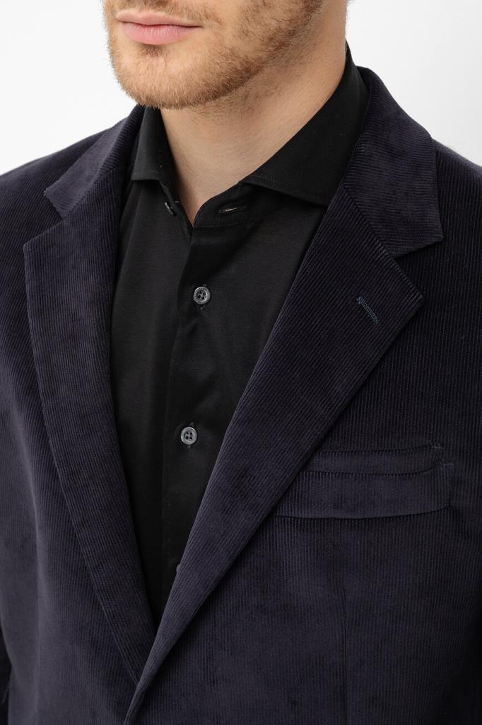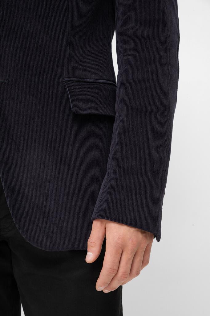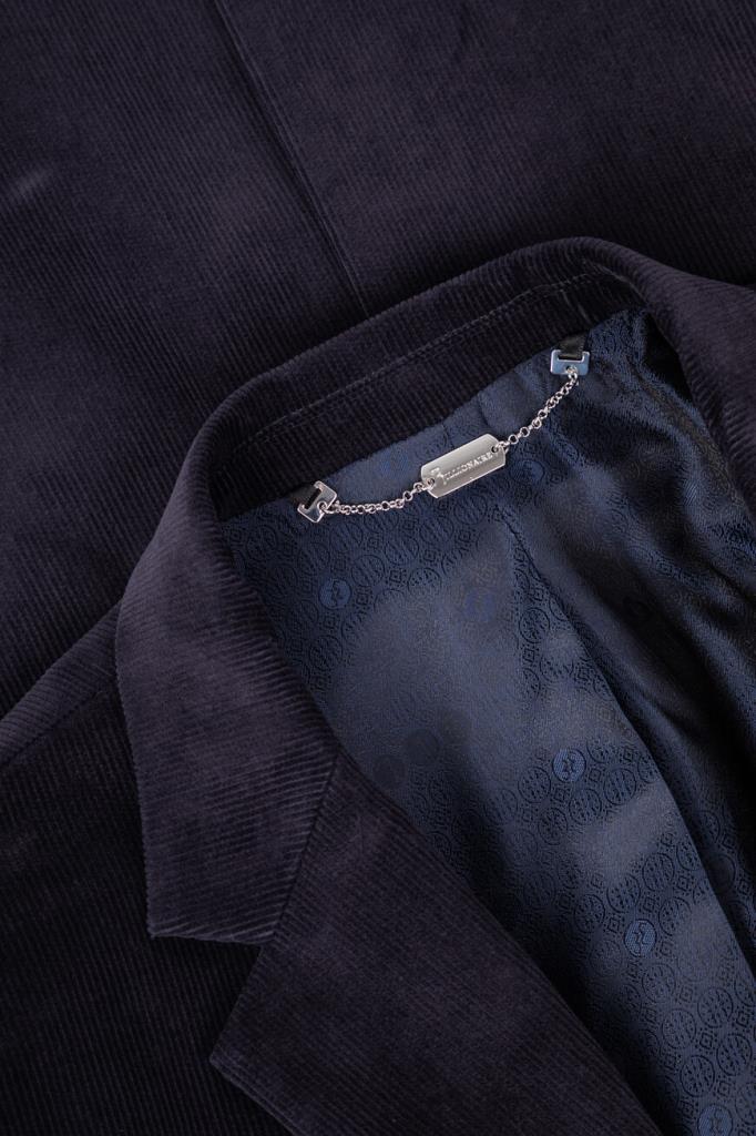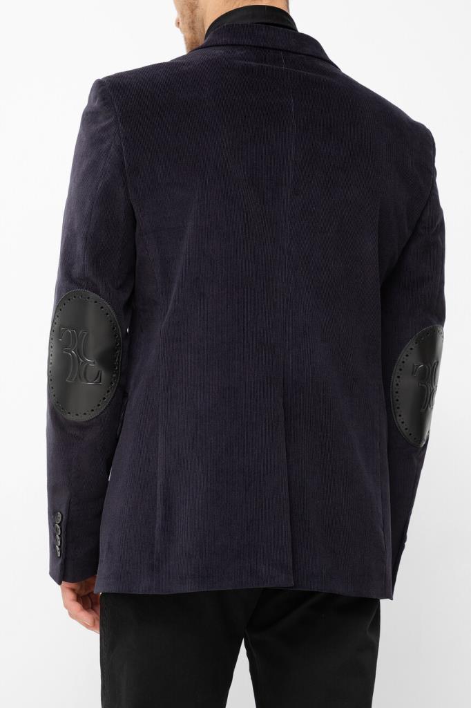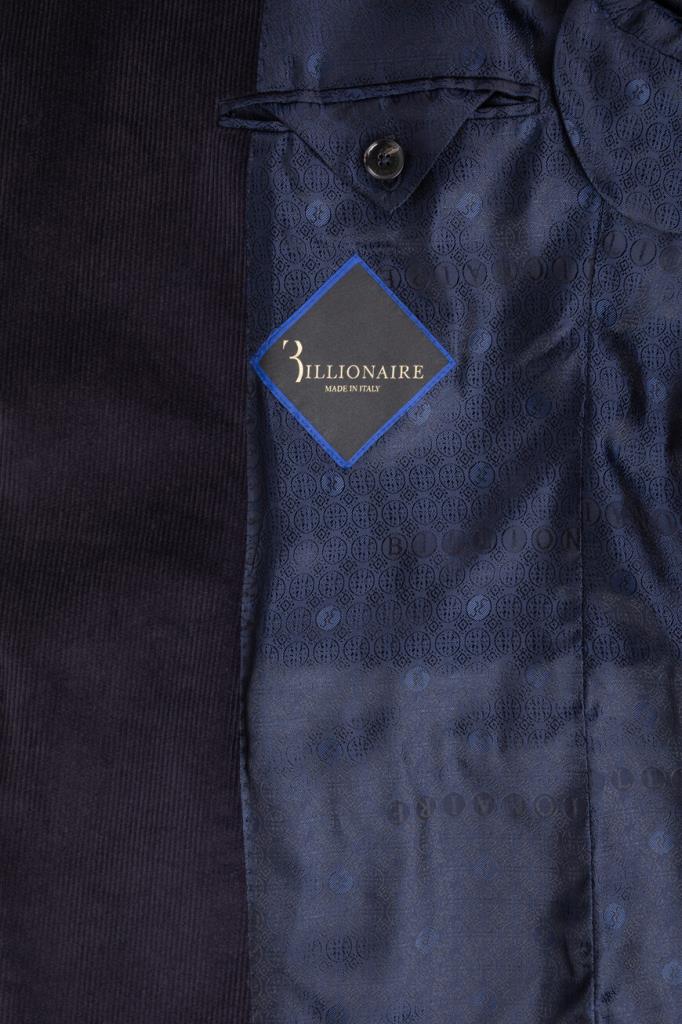 Вельветовый блейзер тёмно-синего цвета от Billionaire. Фасон однобортной модели стрейч предполагает полуприлегающий крой и застёжку на две крупные роговые пуговицы. Отличительными деталями стали чёрные кожаные накладки с монограммой Дома и перфорированным узором по краю на рукавах и принтованная подкладка на основе прочного вискозного волокна и ацетата в тон пиджаку.