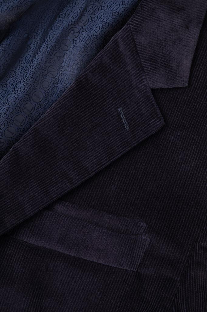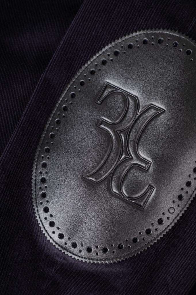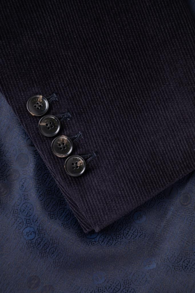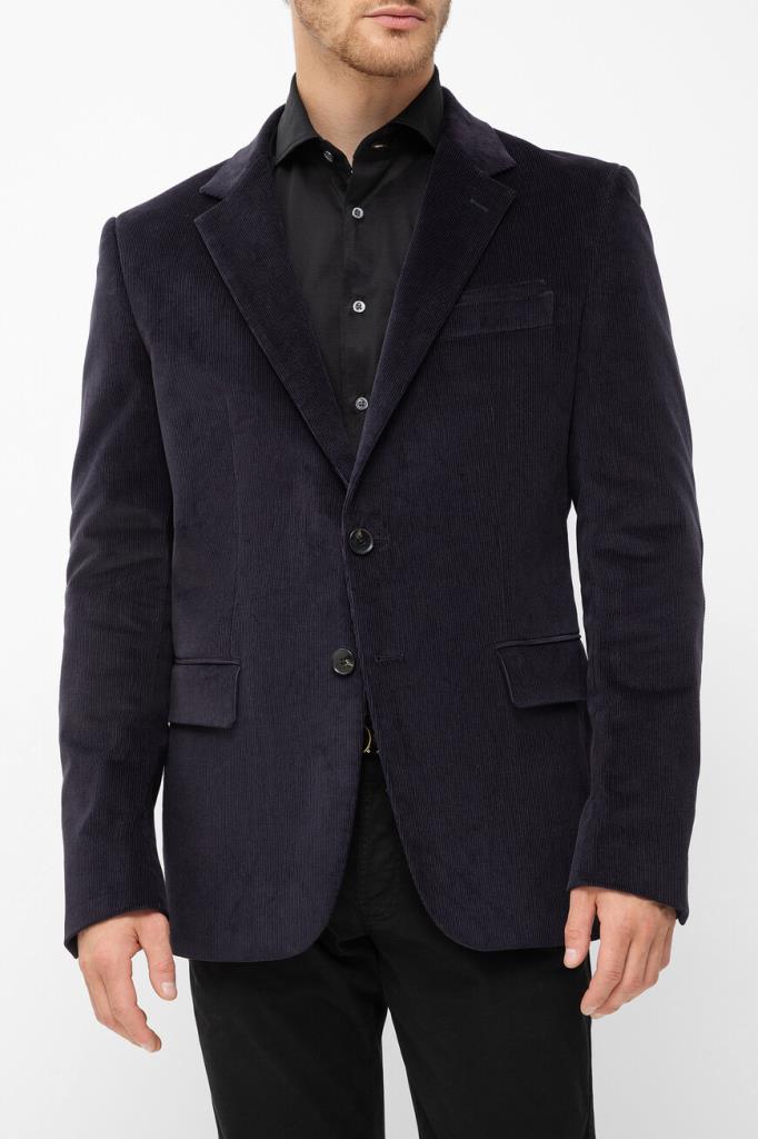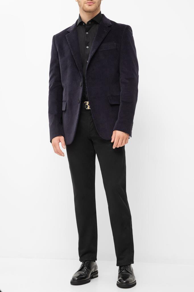 Вельветовый блейзер тёмно-синего цвета от Billionaire. Фасон однобортной модели стрейч предполагает полуприлегающий крой и застёжку на две крупные роговые пуговицы. Отличительными деталями стали чёрные кожаные накладки с монограммой Дома и перфорированным узором по краю на рукавах и принтованная подкладка на основе прочного вискозного волокна и ацетата в тон пиджаку.