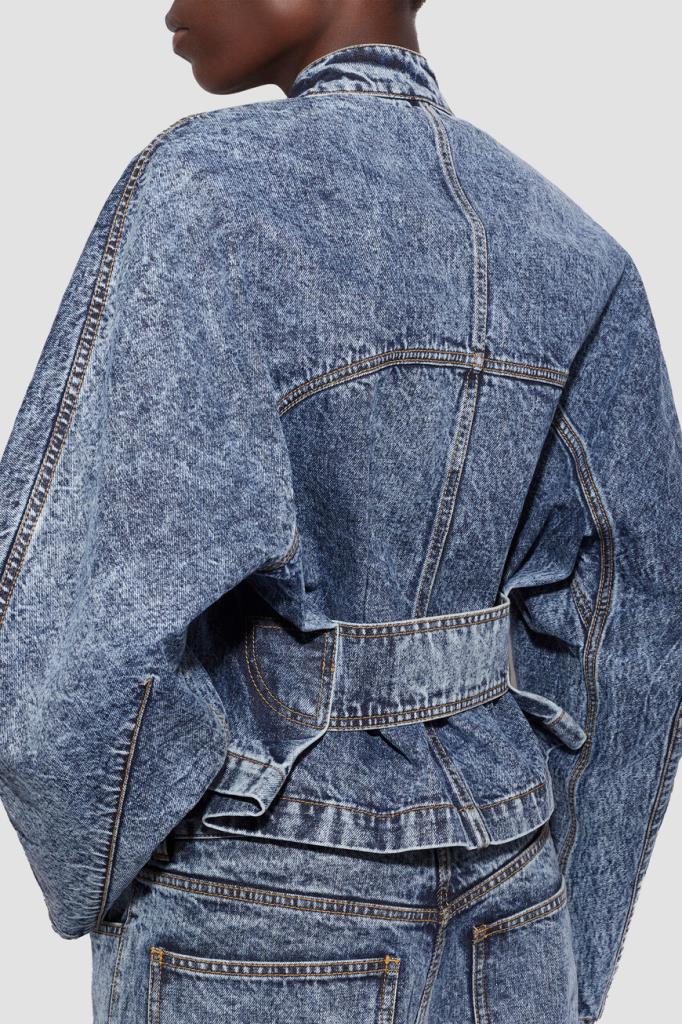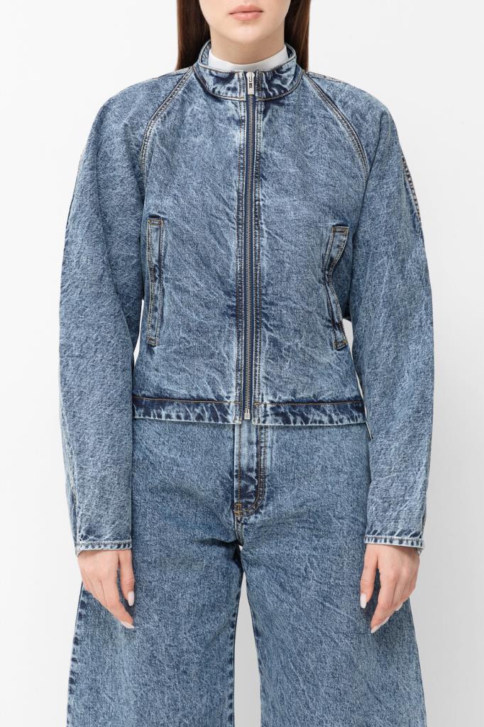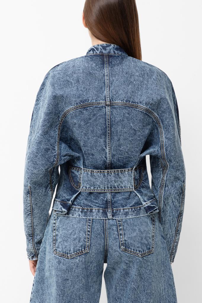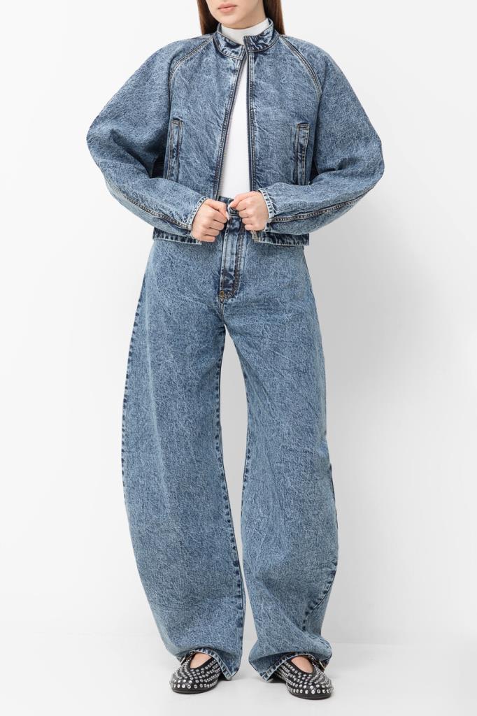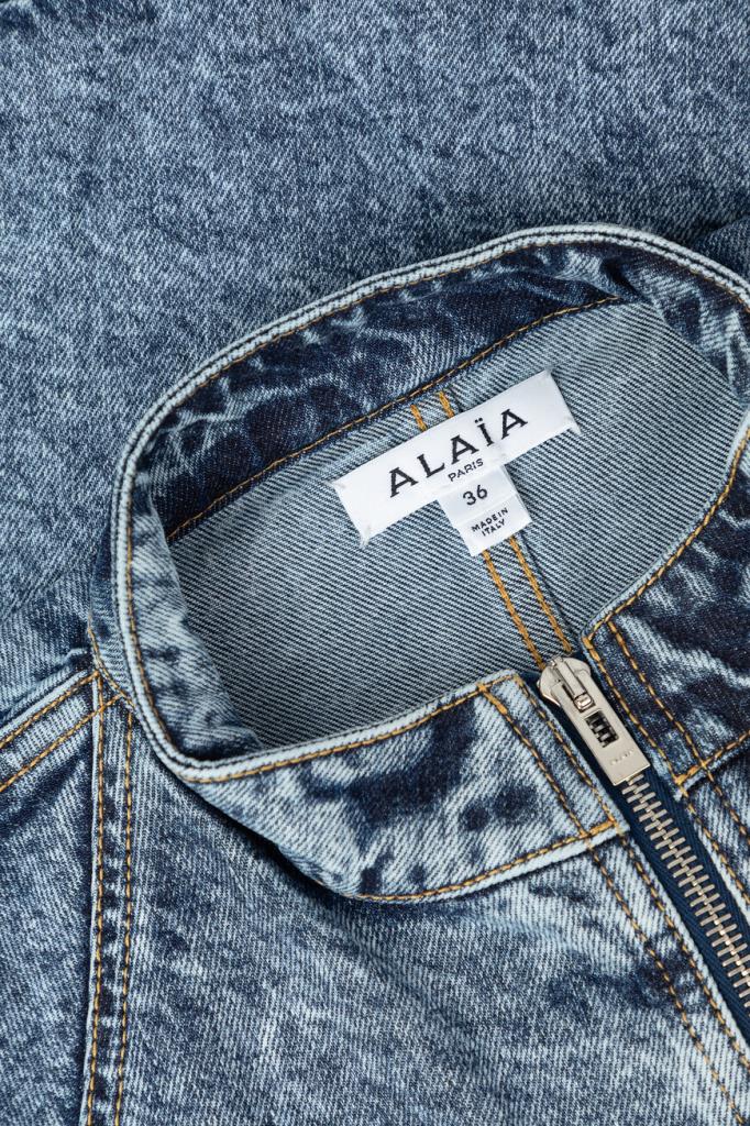 Синяя куртка полуприталенного силуэта от бренда ALAIA. Для изготовления короткой модели с выбеленным эффектом используется прочный хлопковый деним японского происхождения. Изделие застёгивается на серебристую молнию и отличается широким ремешком-сборкой сзади, подчеркивающей линию талии. Отличительными деталями стали прострочка на швах и длинные рукава округлой формы. Куртку можно сочетать с облегающим боди с невысоким воротником-стойкой и джинсами из той же коллекции.