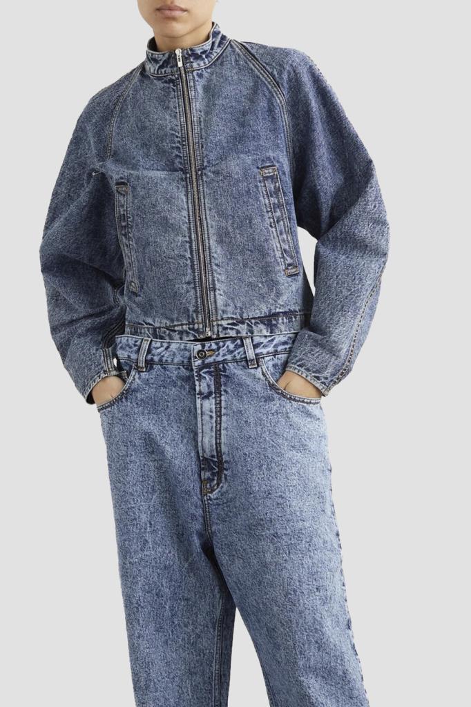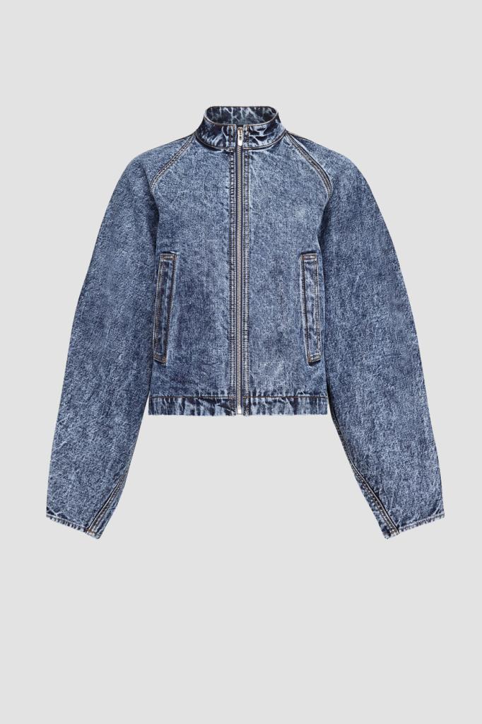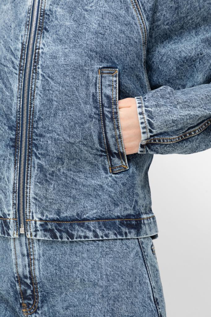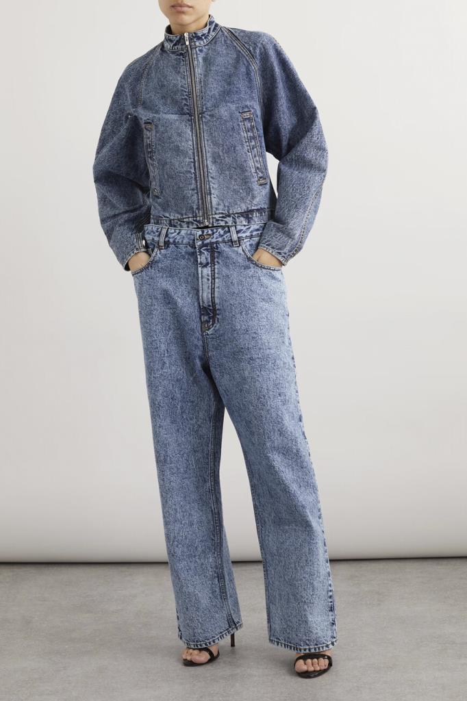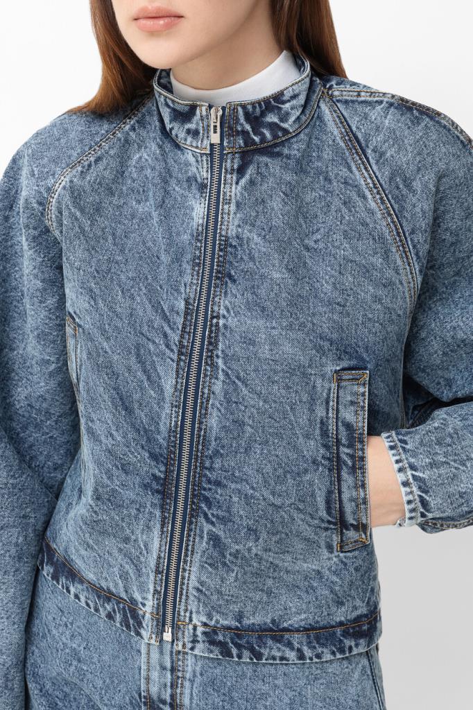 Синяя куртка полуприталенного силуэта от бренда ALAIA. Для изготовления короткой модели с выбеленным эффектом используется прочный хлопковый деним японского происхождения. Изделие застёгивается на серебристую молнию и отличается широким ремешком-сборкой сзади, подчеркивающей линию талии. Отличительными деталями стали прострочка на швах и длинные рукава округлой формы. Куртку можно сочетать с облегающим боди с невысоким воротником-стойкой и джинсами из той же коллекции.
