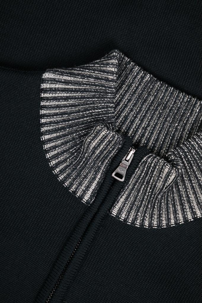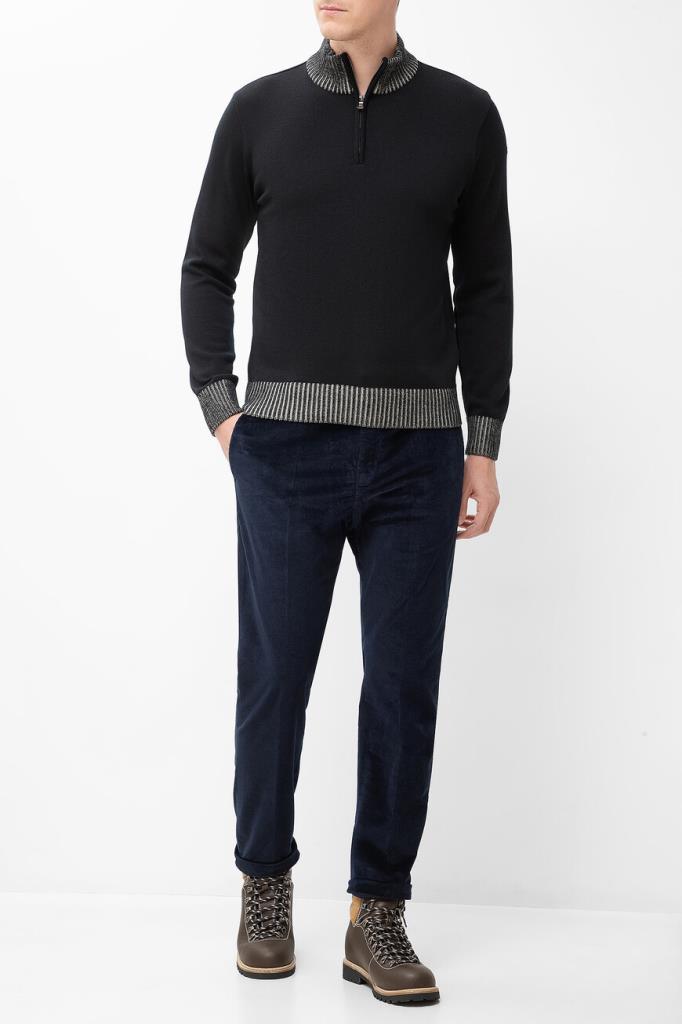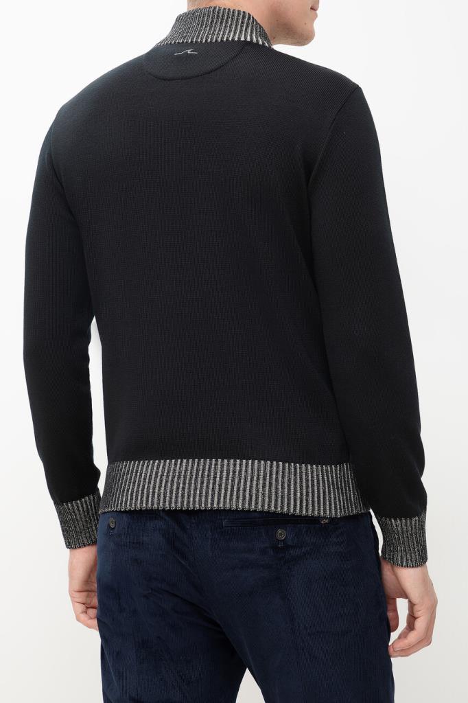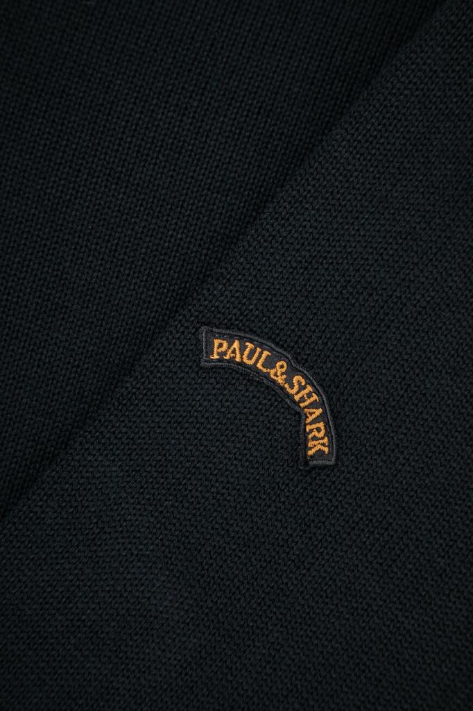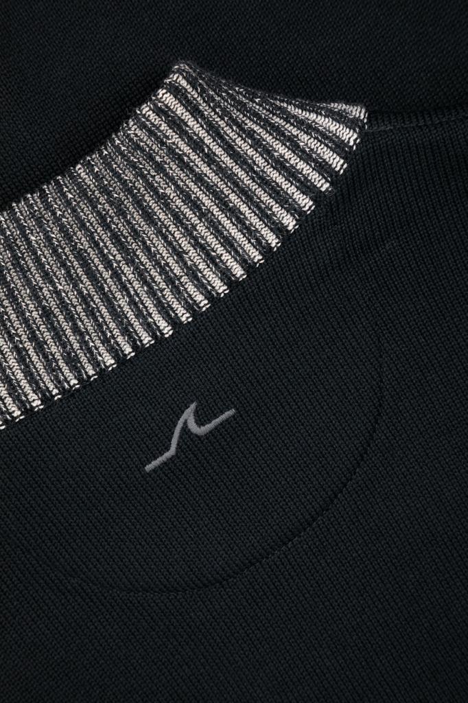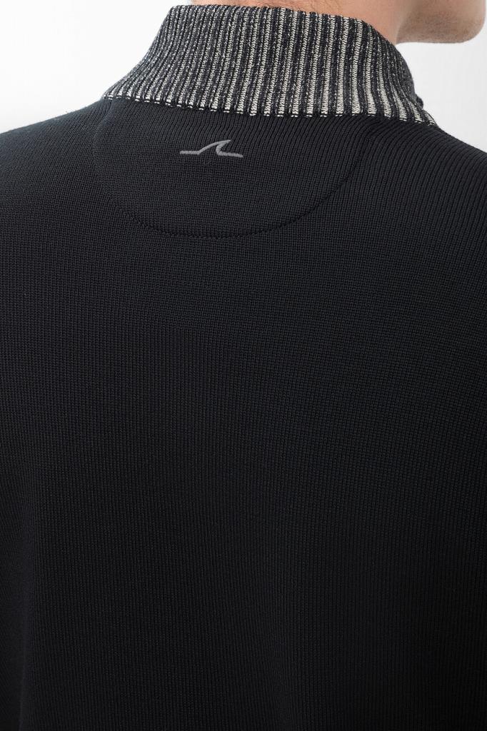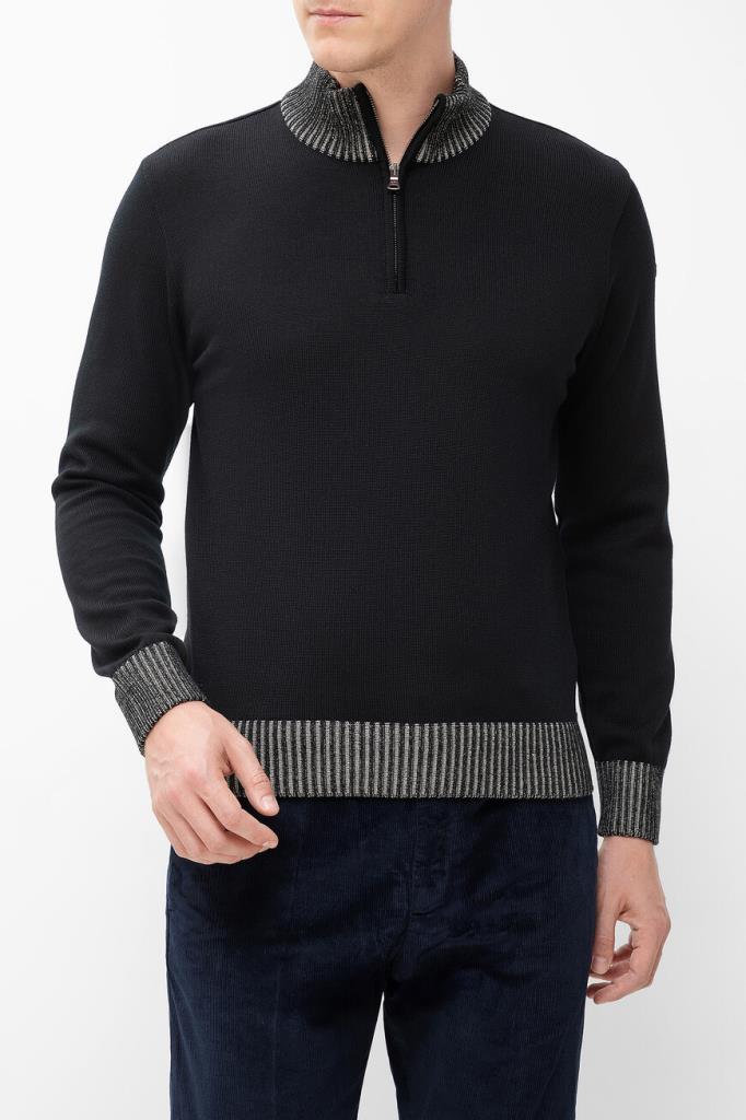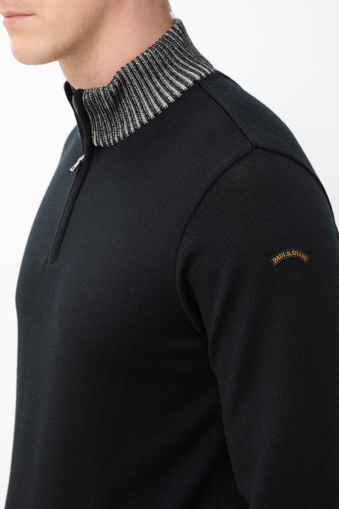 Свитер с высоким воротником-стойкой на молнии от бренда Paul&Shark. Для изготовления модели чёрного цвета используется мягкая тонкая шерсть virgin, которая поддерживает оптимальный микроклимат. Рифлёный полосатый мотив на вороте, манжетах и поясе подчёркнут нитью контрастного оттенка. Атрибутами Дома стали патч с вышитым логотипом на левом рукаве и серая культовая символика - силуэт острого плавника акулы, вышитый на кокетке.