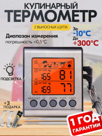 Комплектация: Кухонный термометр; 测试测试; Держатель для термометра 2 шт; ААА Батарейка типа 1 шт; Выносной термощуп на проводе 2 шт