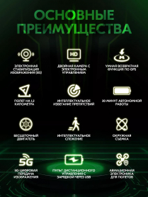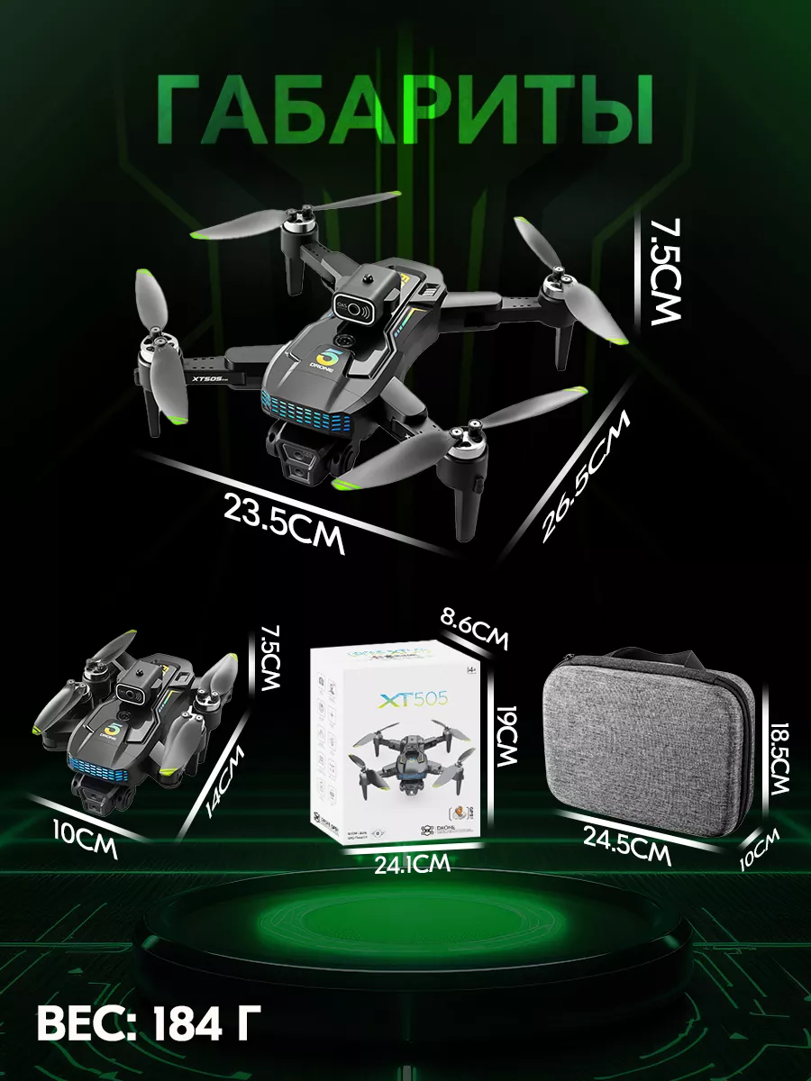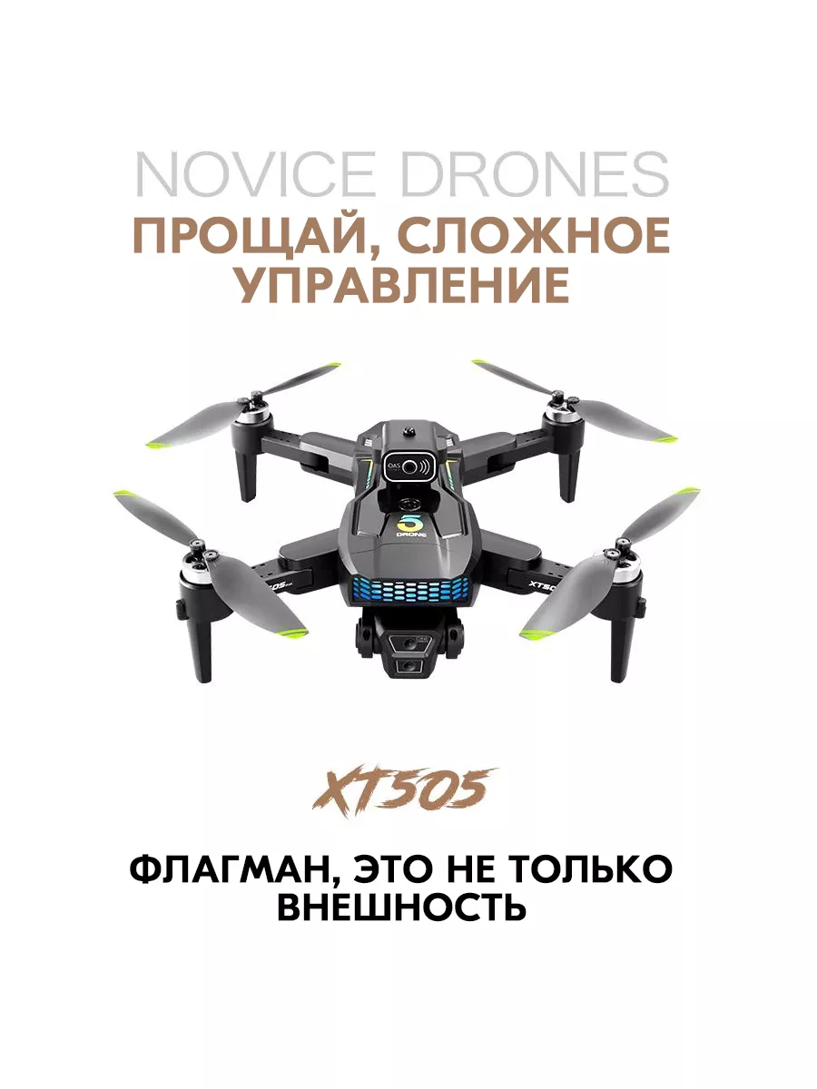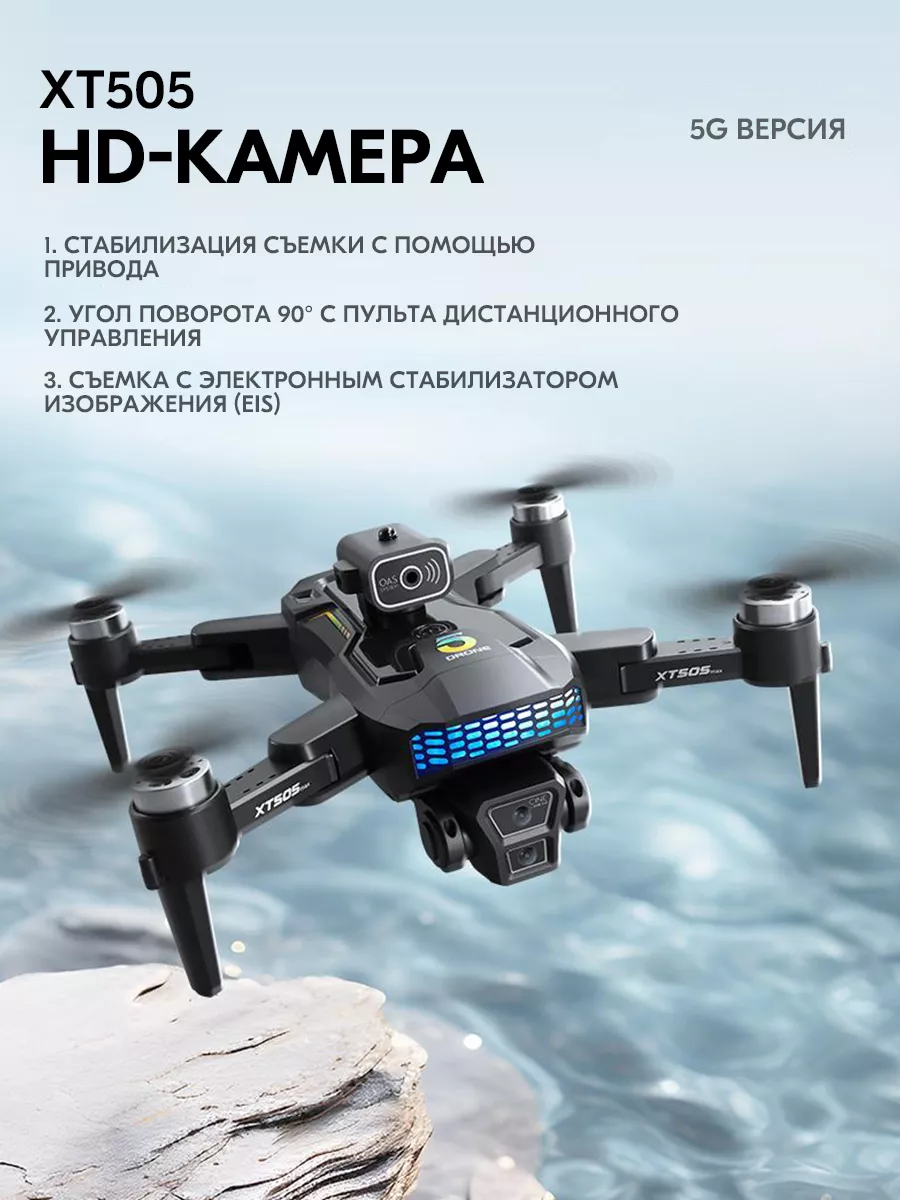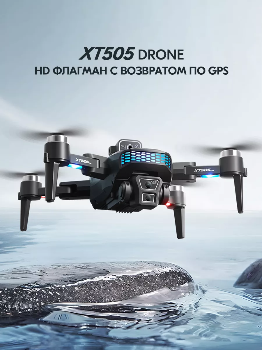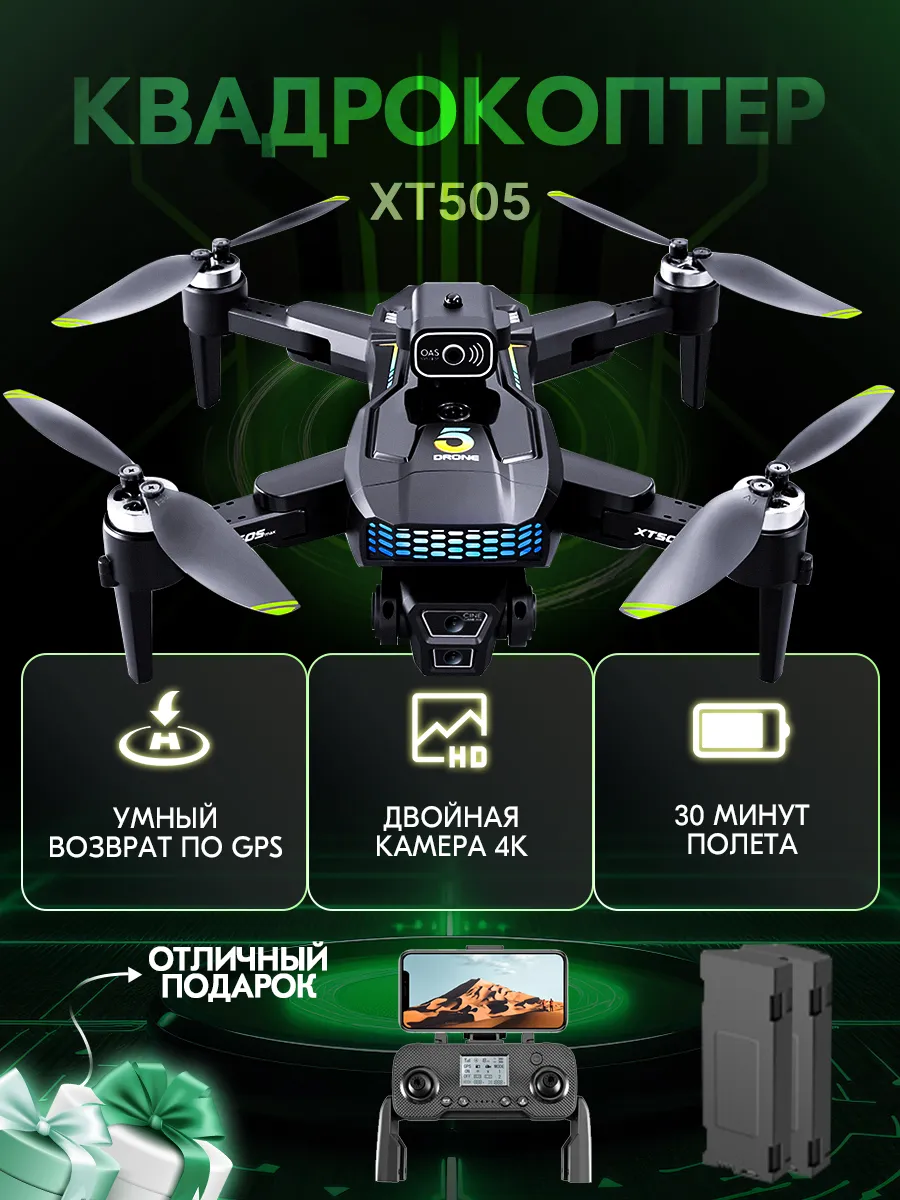 Описание квадрокоптера модели XT505 5G складной GPS-дрон с двойной WIFI камерой, профессиональный аппарат для аэрофотосъемки Модель XT505 представляет собой передовой квадрокоптер среднего размера с современными функциями и возможностями, который станет идеальным выбором как для новичков, так и для более опытных пилотов. Основные характеристики и возможности: Фронтальная и нижняя камеры: Фронтальная камера с широкоугольным объективом, разрешением 4K HD и поддержкой WIFI. Нижняя камера также высокого разрешения, с возможностью переключения угла съемки и стабилизации по гиру. Использование технологии EIS (электронная стабилизация изображения) гарантирует четкость и устойчивость фотографий. GPS и точное позиционирование: Встроенная система GPS позволяет дрону точно позиционироваться, автоматизировать возврат домой при потере сигнала или низком заряде аккумулятора. Увеличенная емкость аккумулятора: Литиевый аккумулятор 3.7V емкостью 2000mAh обеспечивает время полета до 22 минут. Настройка маршрутов: Возможность настройки индивидуальных маршрутов полета через специальное приложение для смартфонов. Интеллектуальные функции: Функция умного следования (Intelligent Follow), кругового полета, контроля жестами, ручного управления с помощью ладони, а также точное расположение по карте и возможность дистанционного контроля дрона через мобильное приложение. Автоматическая система возврата домой по нажатию одной кнопки. Дополнительные функции: Управление жестами для съемки фотографии. Оптическое позиционирование. Бесщеточные моторы, которые обеспечивают более мощную тягу и длительный срок службы. Обнаружение препятствий и автоматическое предотвращение столкновений. Компактные размеры и легкость конструкции: Вес всего 184 грамма. Благодаря легкому весу дрон не подпадает под требования регистрации или получения лицензии в ряде стран (где это требуется для устройств весом более 250 граммов).