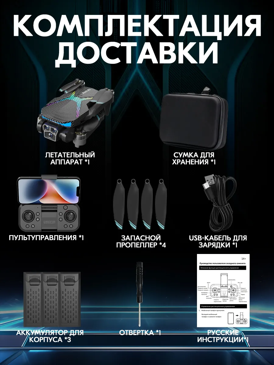 квадрокоптер AE7Pro; 3 аккумулятора; 4 запасные лопасти; 3 батарейки АА; Инструкция на русском языке; 食物垃圾粉碎机; кабель для зарядки