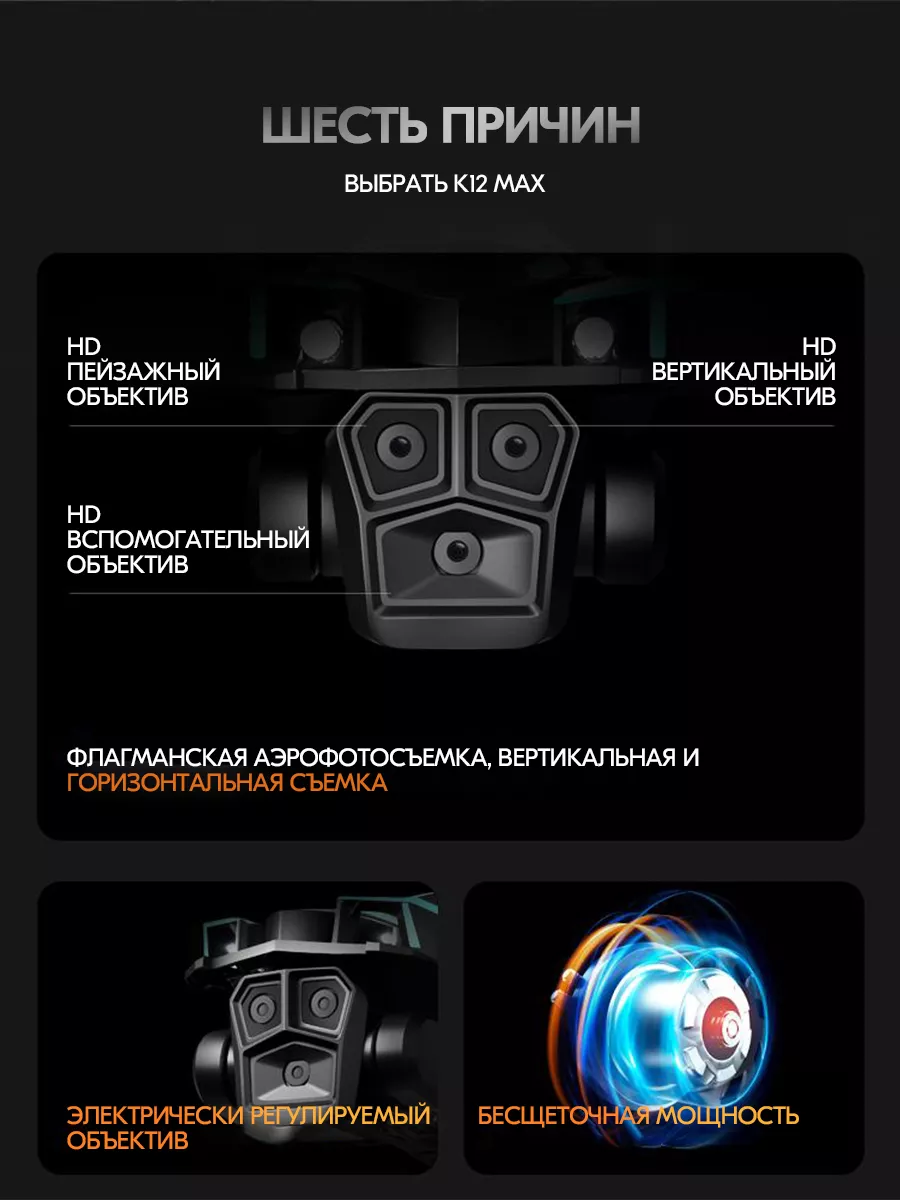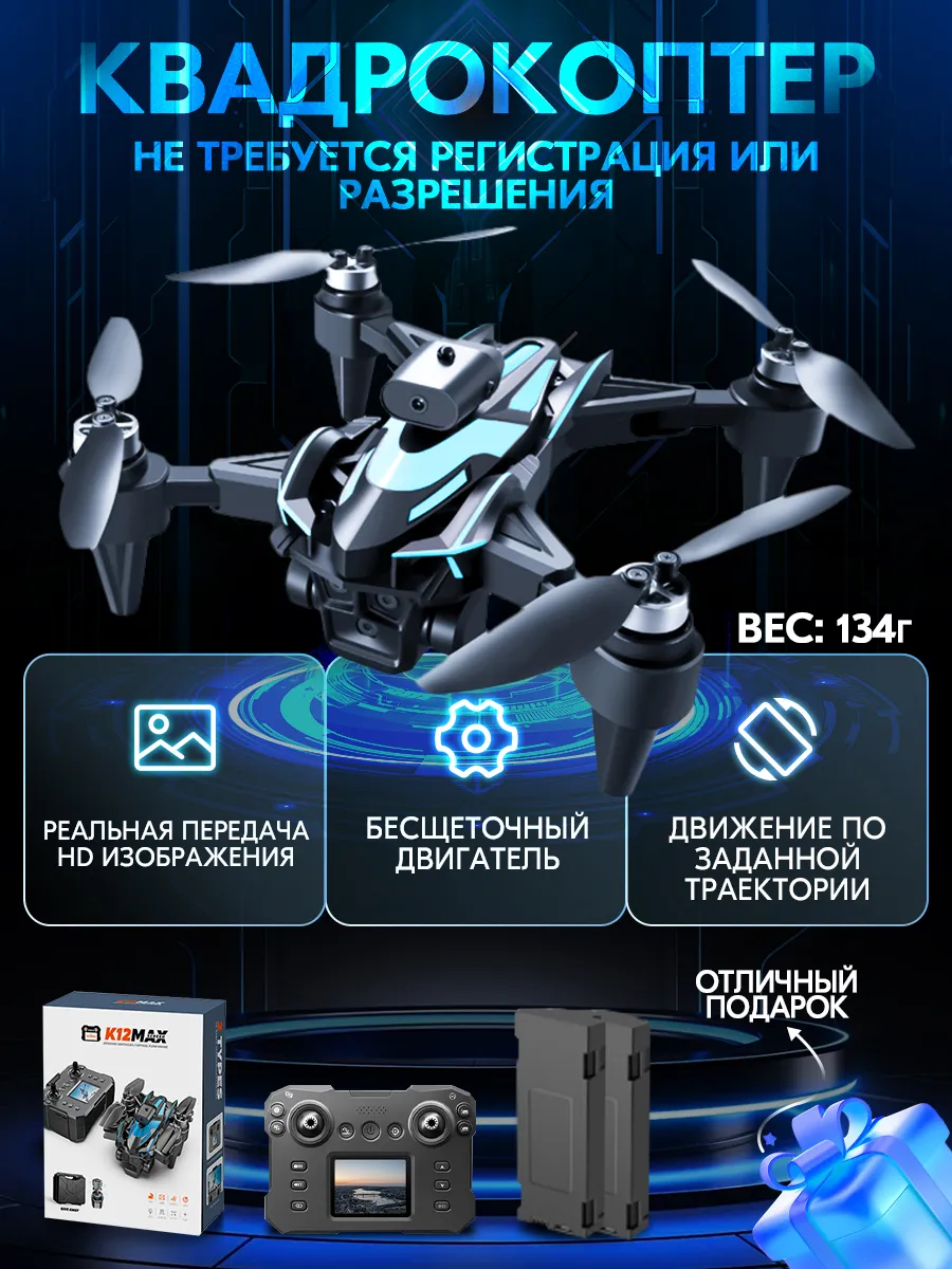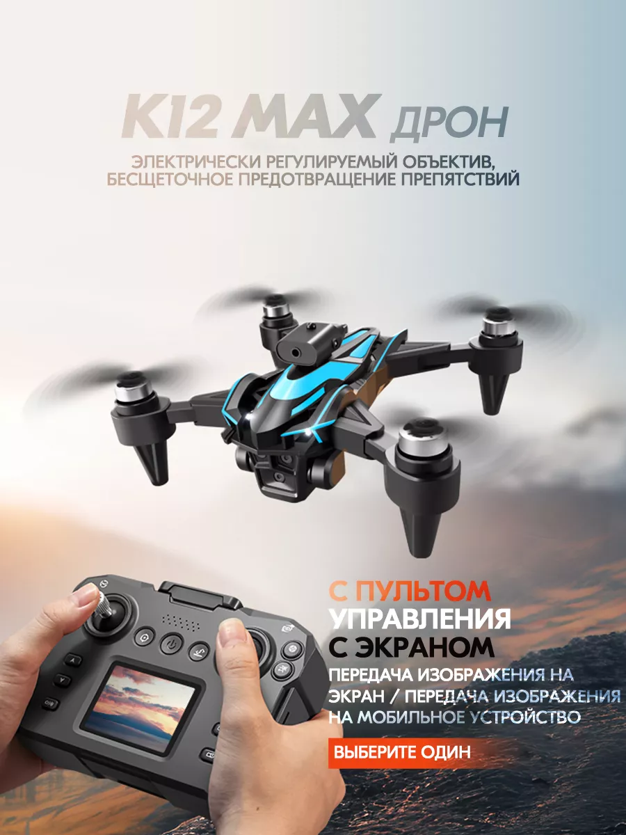 Квадрокоптер K12 Max – беспилотный аппарат с множеством функций, идеально подходящий для начинающих пилотов. Этот дрон станет отличным подарком для любителей полетов и технологий. Основные характеристики: Фронтальная камера с подсветкой: яркие фото и видео с высоты птичьего полета. Бесщеточные двигатели: мощность и устойчивость к порывам ветра. Управление: Пульт с экраном и приложение для смартфонов: передача изображения в реальном времени и простое управление. Электрическое управление камерой: горизонтальная, вертикальная и наклонная съемка. Оптическое позиционирование: точный контроль. Складной пульт управления: удобство хранения и транспортировки. Функции полета: Барометр: удержание высоты. Передача HD изображения в реальном времени. Датчик давления и гравитационный сенсор: стабильный полет. Рисование траектории полета через приложение. Специальные маневры и трюки. Переключение скоростей. Управление через смартфон. Одна кнопка для взлета и посадки. Преимущества: Компактный и складной дизайн, легкость транспортировки. Высококачественные материалы, обеспечивающие долговечность. Эргономичность и стильный дизайн. Простота и безопасность управления, идеально для начинающих. K12 Max – превосходный подарок для любого праздника: дня рождения, Нового года, 8 марта и других особых событий. Этот квадрокоптер понравится как взрослым, так и детям, открывая новые горизонты и даря незабываемые впечатления. Почему выбирать K12 Max: Современные функции и легкость управления. Долгое время полета благодаря трем аккумуляторам. Прочный и надежный дизайн. Интуитивное и безопасное управление. Подарите своим близким радость и новые возможности с квадрокоптером K12 Max