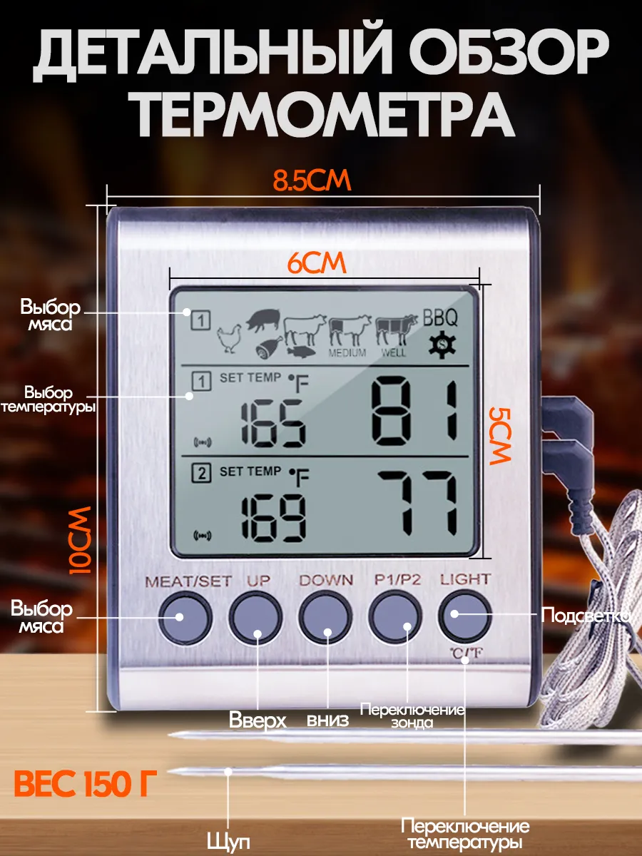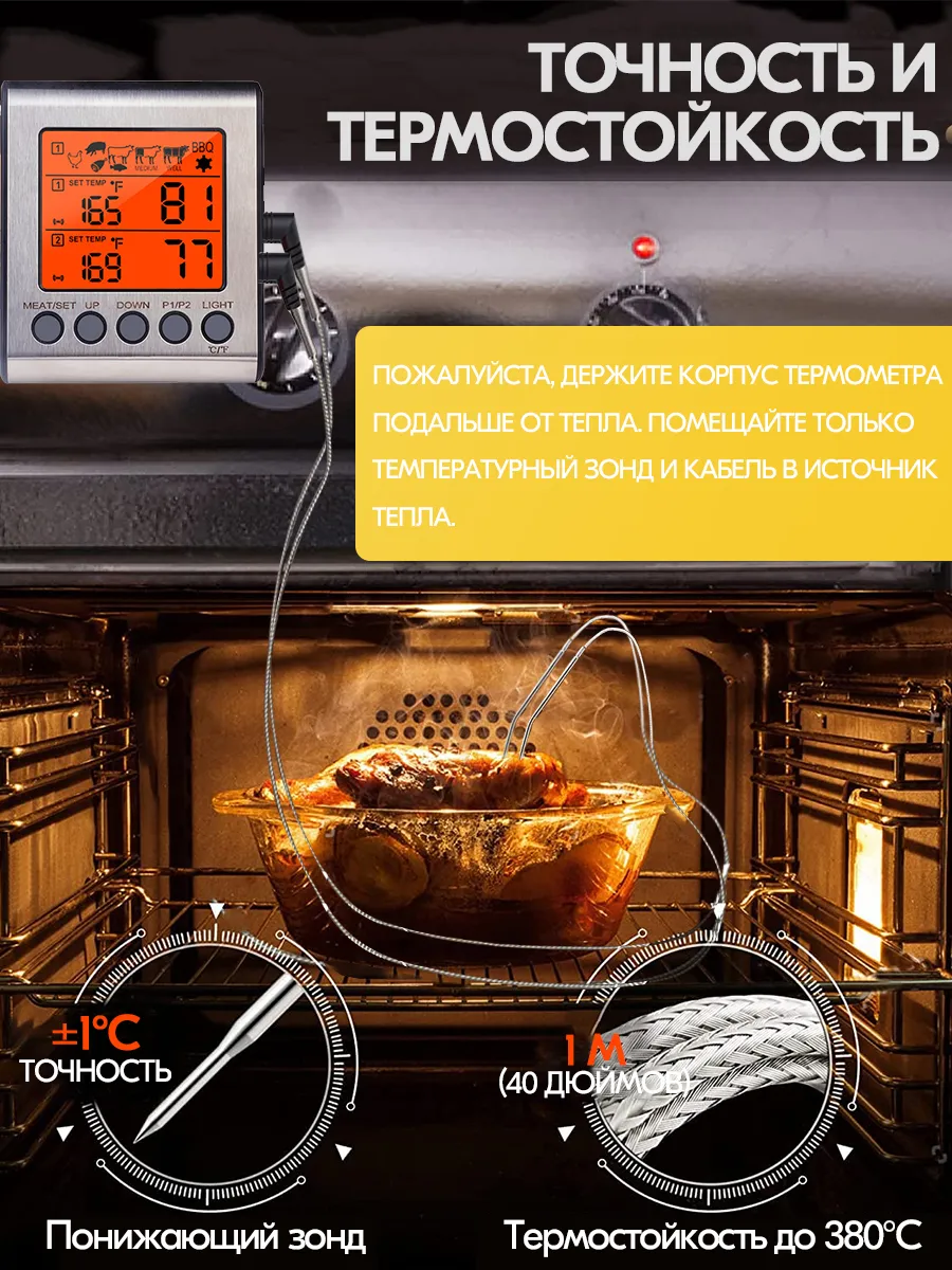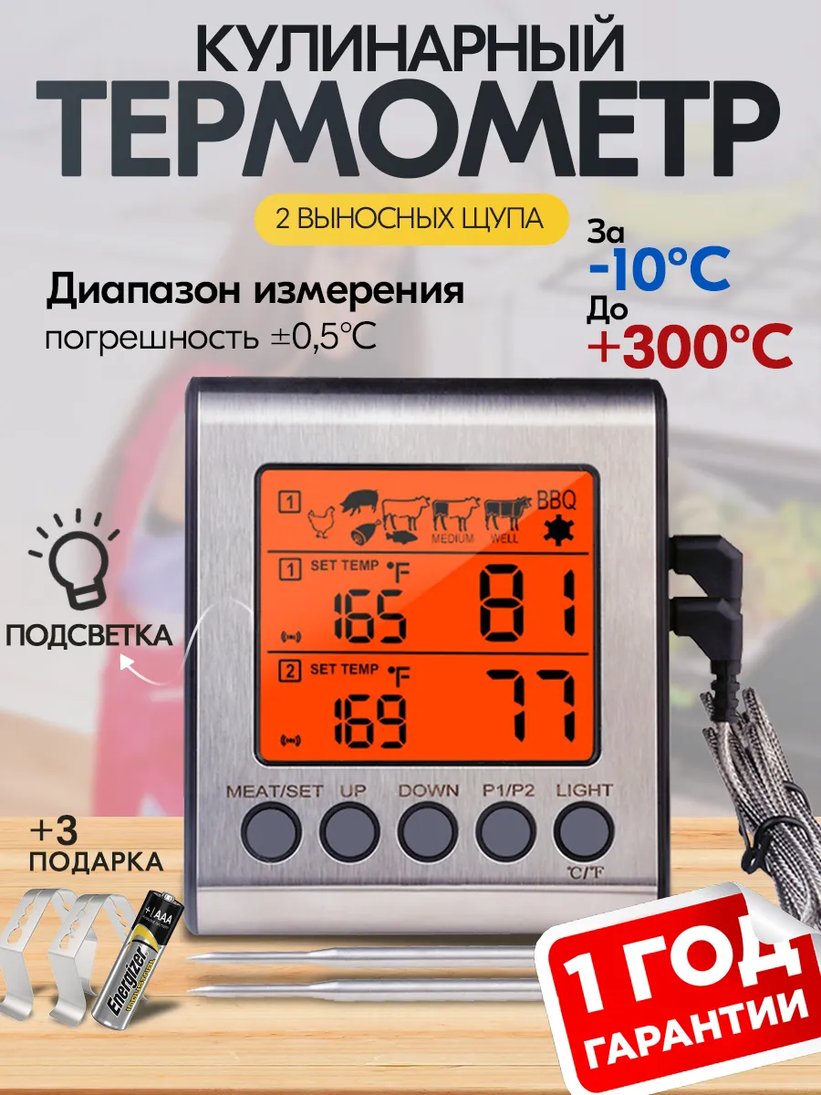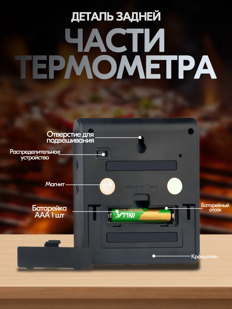 Кухонный термометр; 测试测试; Держатель для термометра 2 шт; ААА Батарейка типа 1 шт; Выносной термощуп на проводе 2 шт