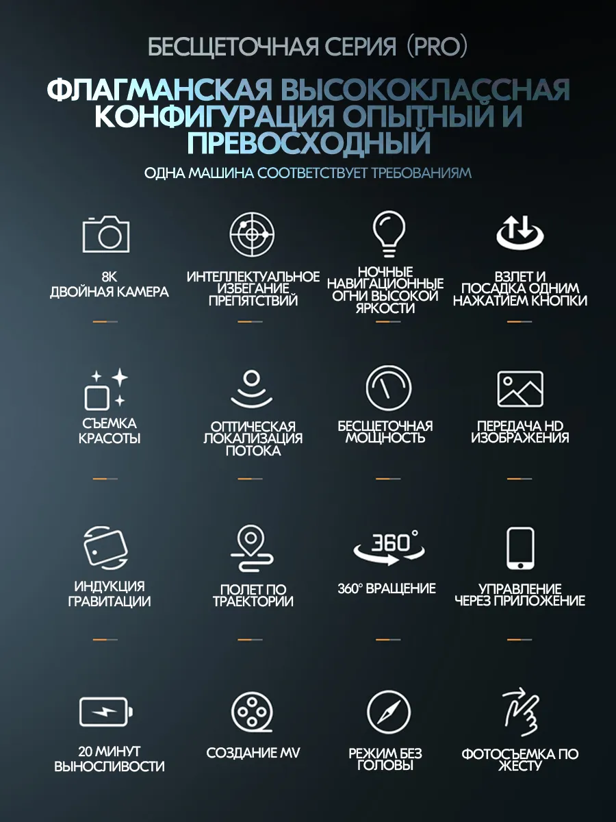 Мы рады представить вам квадрокоптер с двумя камерами и мощным бесщеточным двигателем. Этот профессиональный квадрокоптер обладает всеми функциями, которые делают управление интуитивно простым и понятным. Управление доступно как с пульта, так и с экрана вашего гаджета, на котором можно нарисовать траекторию движения, по которой дрон автоматически будет двигаться и снимать видео. Изображение с камеры дрона можно просматривать в режиме реального времени, а все записи сохраняются в память мобильного устройства. Такие функции, как движение за объектом и съемка вокруг объекта, также доступны в этом дроне. Режим Headless mode упрощает управление, делая его идеальным для начинающих. Радиоуправляемый угол наклона 90 градусов позволяет делать красивые снимки с высоты. Квадрокоптер оснащен технологией распознавания жестов рук, что позволяет легко записывать видео или делать фото. С установленным бесколлекторным мотором, который обеспечивает мощность, долговечность и тихую работу, дрон способен летать даже в ветреную погоду, не теряя при этом контроль. Этот двигатель используется только в профессиональных съемочных дронах. Квадрокоптер также имеет систему 2.4G оптического потока и четырехстороннего избегания препятствий, что делает его еще более удобным и безопасным в использовании. Модель оснащена двумя камерами с Wi-Fi и подвесом с сервоприводом для стабильной съемки, а также эффектной подсветкой. Складной дизайн и переносной кейс упрощают транспортировку, чтобы вы всегда могли взять дрон с собой в поездку. Для вашего удобства мы полностью перевели и подробно описали весь функционал дрона и мобильного приложения в инструкции. Также для вашего удобства предусмотрена служба поддержки, где мы поможем решить любой вопрос по использованию дрона. Идеальный подарок для любителей развлечений и гаджетов, FPV начинающих или детской электроники!